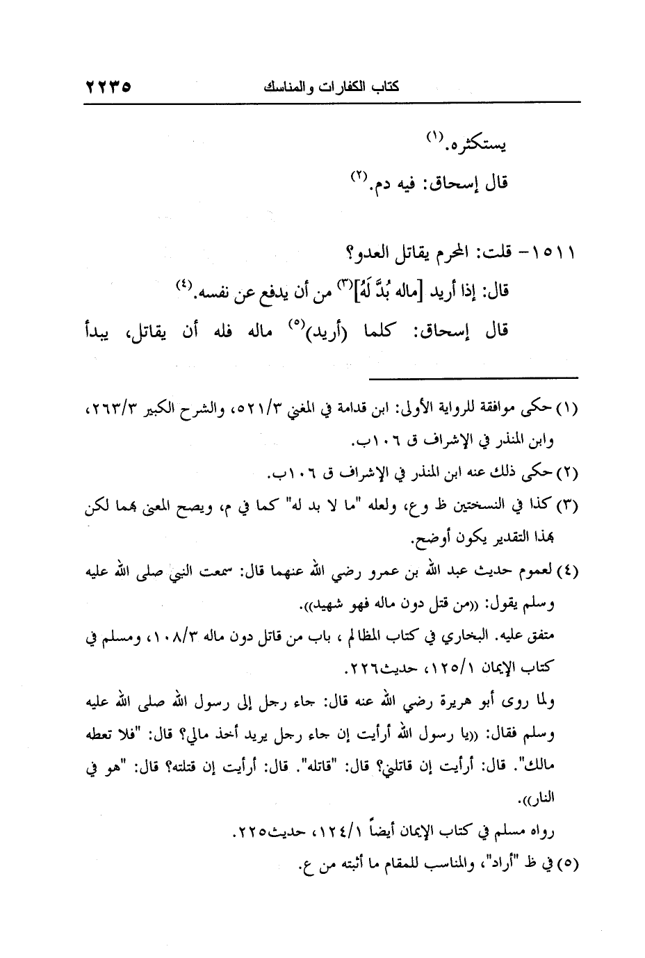 قال إسحاق: كلما (أريد) 5 ماله فله أن يقاتل، يبدأ