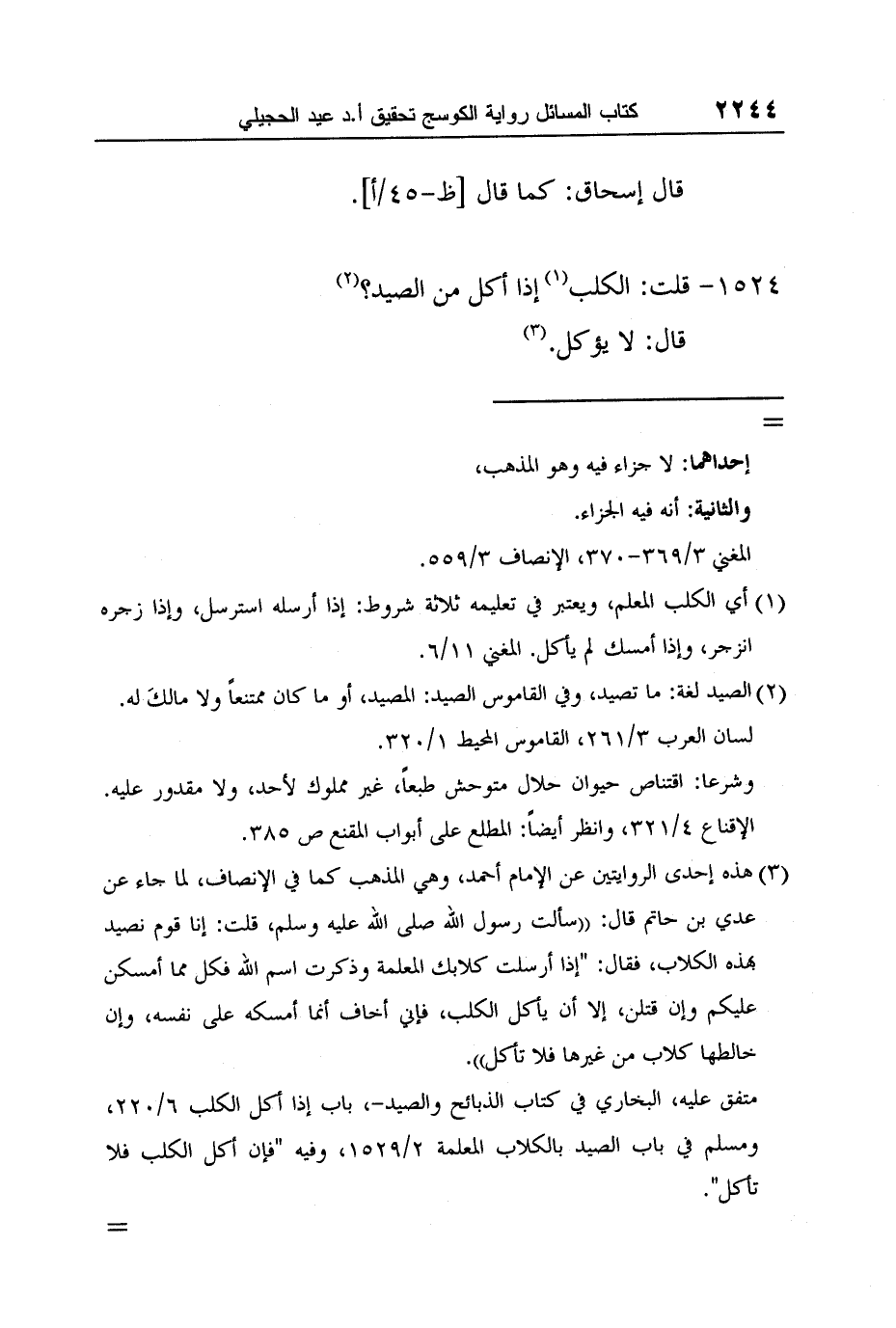 1 أي الكلب المعلم، ويعتبر في تعليمه ثلاثة شروط: إذا أرسله استرسل، وإذا زجره انزجر، وإذا أمسك لم يأكل. المغني 11/6.