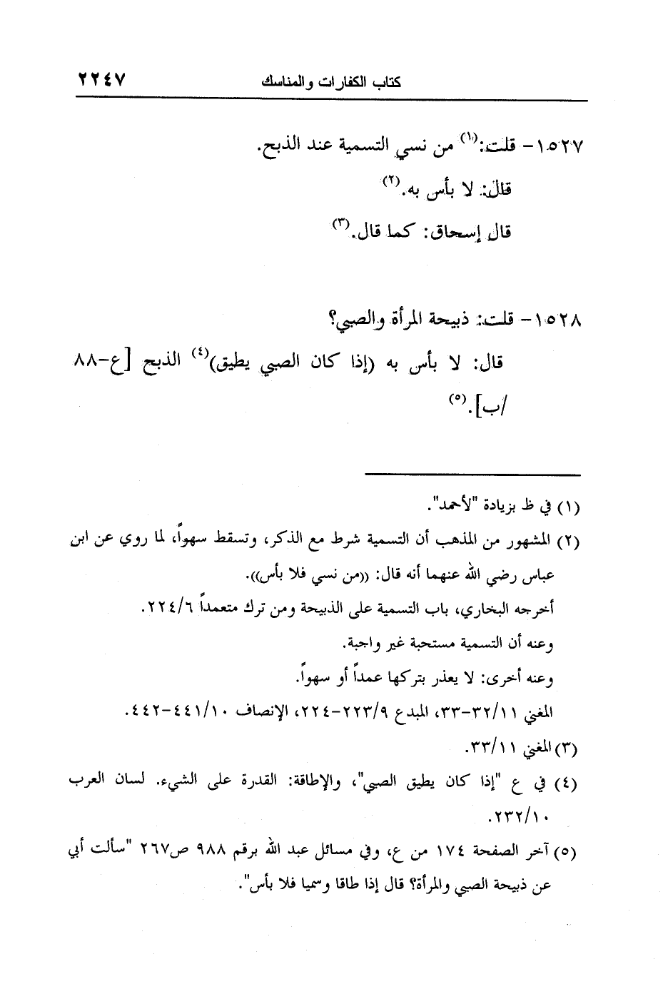 5 آخر الصفحة 174 من ع، وفي مسائل عبد الله برقم 988 ص267 "سألت أبي عن ذبيحة الصبي والمرأة؟ قال إذا طاقا وسميا فلا بأس".