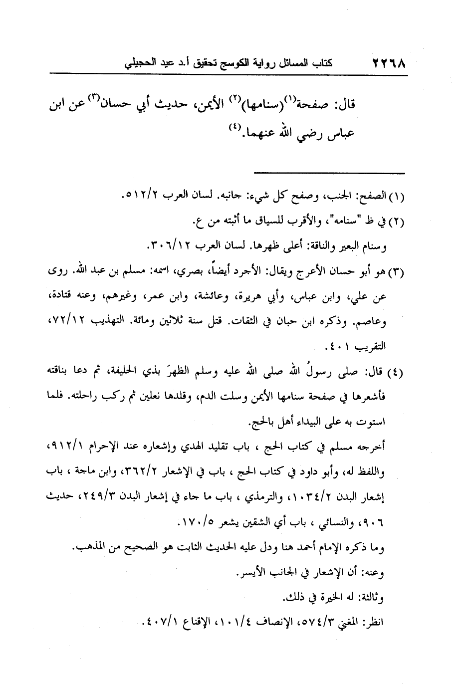 قال: صفحة1 (سنامها) 2 الأيمن، حديث أبي حسان3 عن ابن عباس رضي الله عنهما.4