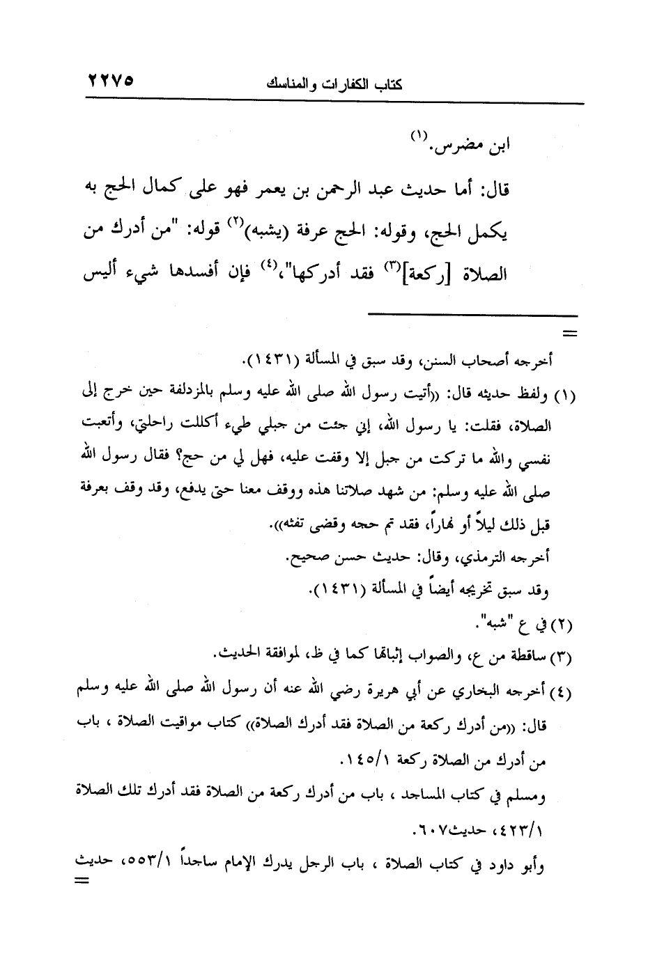 قال: أما حديث عبد الرحمن بن يعمر فهو على كمال الحج به يكمل الحج، وقوله: الحج عرفة (يشبه) 2 قوله: "من أدرك من الصلاة [ركعة] 3 فقد أدركها"،4 فإن أفسدها شيء أليس