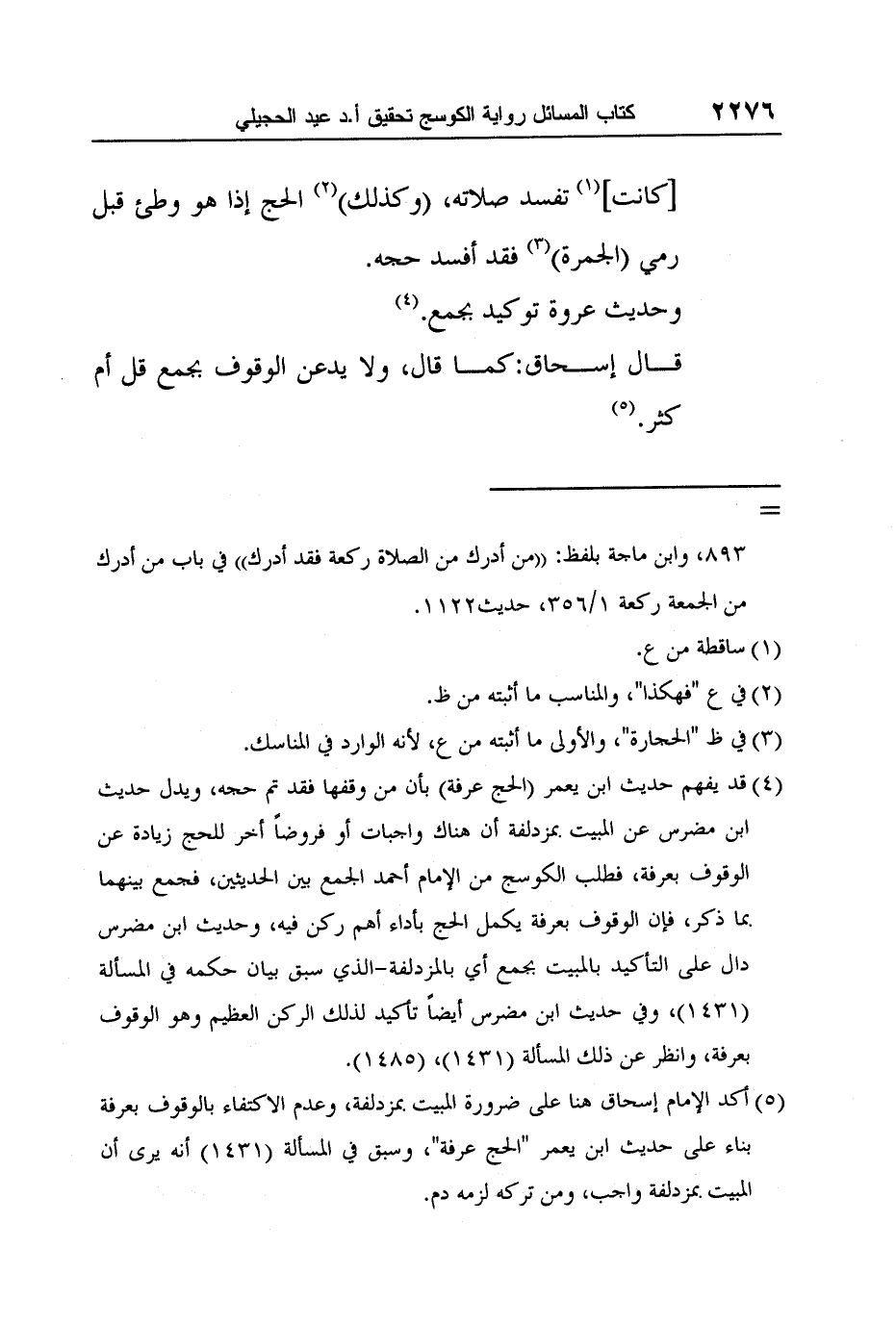 5 أكد الإمام إسحاق هنا على ضرورة المبيت بمزدلفة، وعدم الاكتفاء بالوقوف بعرفة بناء على حديث ابن يعمر "الحج عرفة"، وسبق في المسألة (1431) أنه يرى أن المبيت بمزدلفة واجب، ومن تركه لزمه دم.