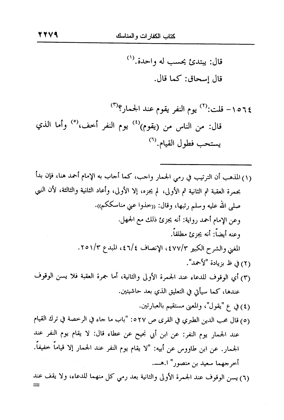 وانظر أيضاً: المسألتين (1644) ، (1654) ولم أقف على تفريق بين النفر وغيره في الوقوف عند الجمار، إلا ما ذكرت في تعليق على قول الإمام أحمد: (من الناس من يقوم يوم النحر أخف) .
