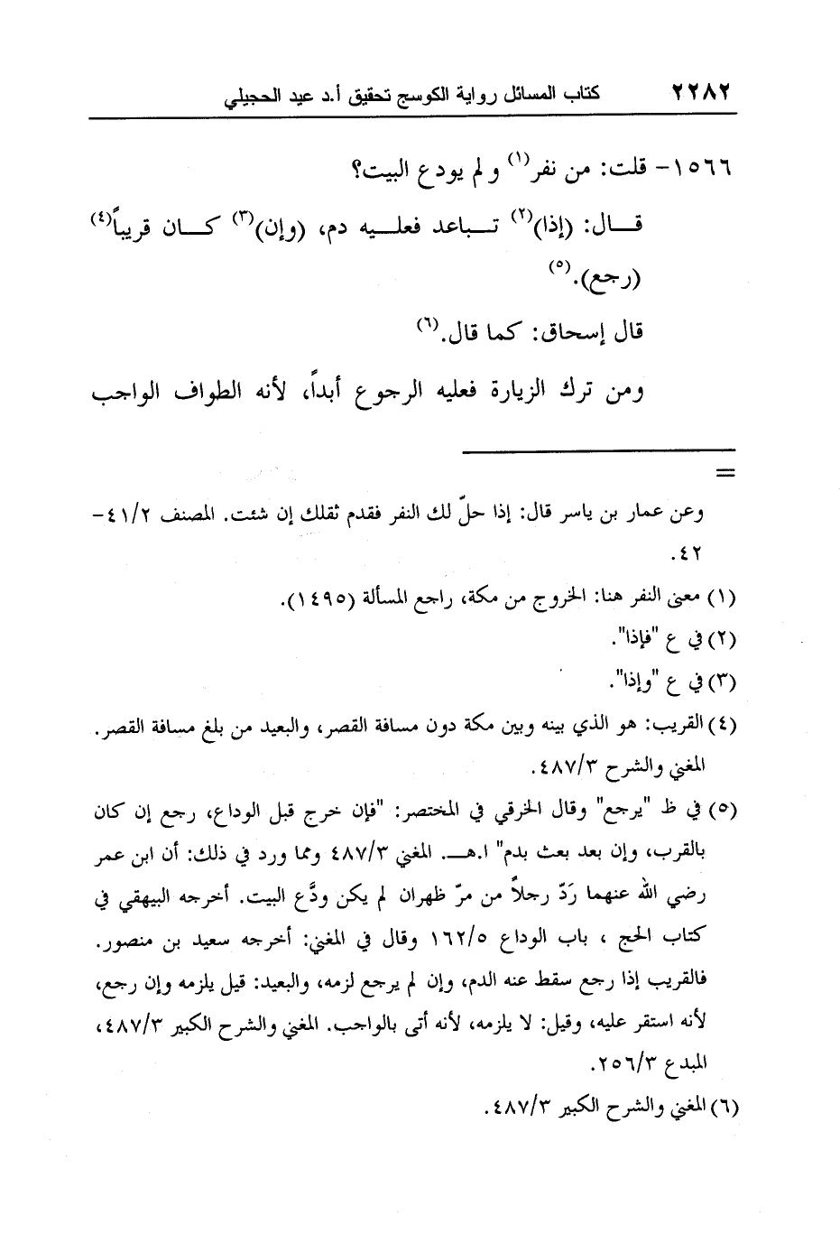 5 في ظ "يرجع" وقال الخرقي في المختصر: "فإن خرج قبل الوداع، رجع إن كان بالقرب، وإن بعد بعث بدم" ا. هـ. المغني 3/487 ومما ورد في ذلك: أن ابن عمر رضي الله عنهما رَدّ رجلاً من مرّ ظهران لم يكن ودَّع البيت. أخرجه البيهقي في كتاب الحج، باب الوداع 5/162 وقال في المغني: أخرجه سعيد بن منصور. فالقريب إذا رجع سقط عنه الدم، وإن لم يرجع لزمه، والبعيد: قيل يلزمه وإن رجع، لأنه استقر عليه، وقيل: لا يلزمه، لأنه أتى بالواجب. المغني والشرح الكبير 3/487، المبدع 3/256.