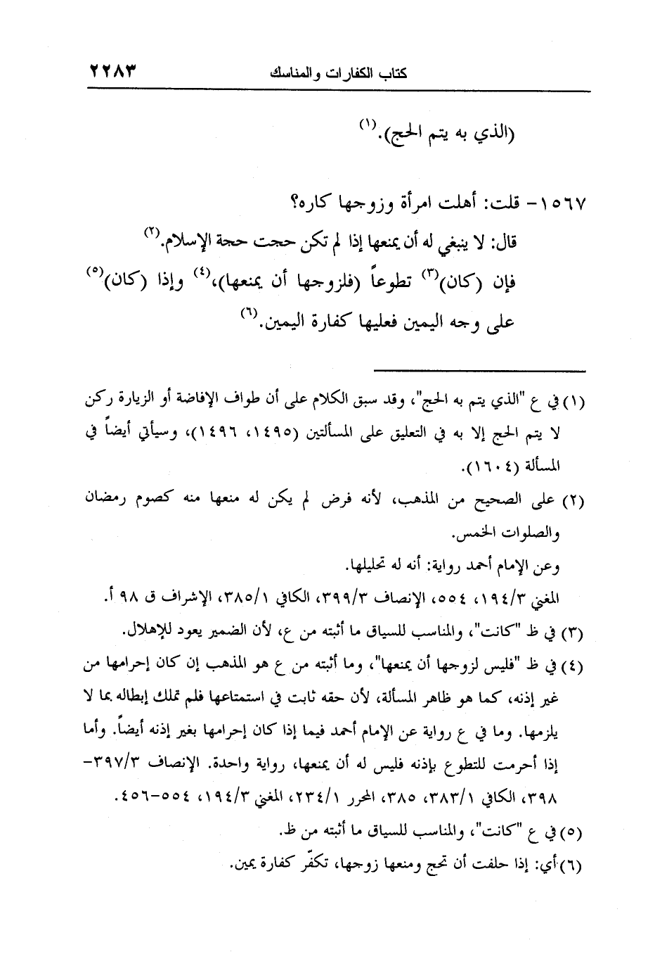 4 في ظ "فليس لزوجها أن يمنعها"، وما أثبته من ع هو المذهب إن كان إحرامها من غير إذنه، كما هو ظاهر المسألة، لأن حقه ثابت في استمتاعها فلم تملك إبطاله بما لا يلزمها. وما في ع رواية عن الإمام أحمد فيما إذا كان [] إحرامها بغير إذنه أيضاً. وأما إذا أحرمت للتطوع بإذنه فليس له أن يمنعها، رواية واحدة. الإنصاف 3/397-[398،] الكافي 1/383، 385، المحرر 1/234، المغني 3/194، 554-456.