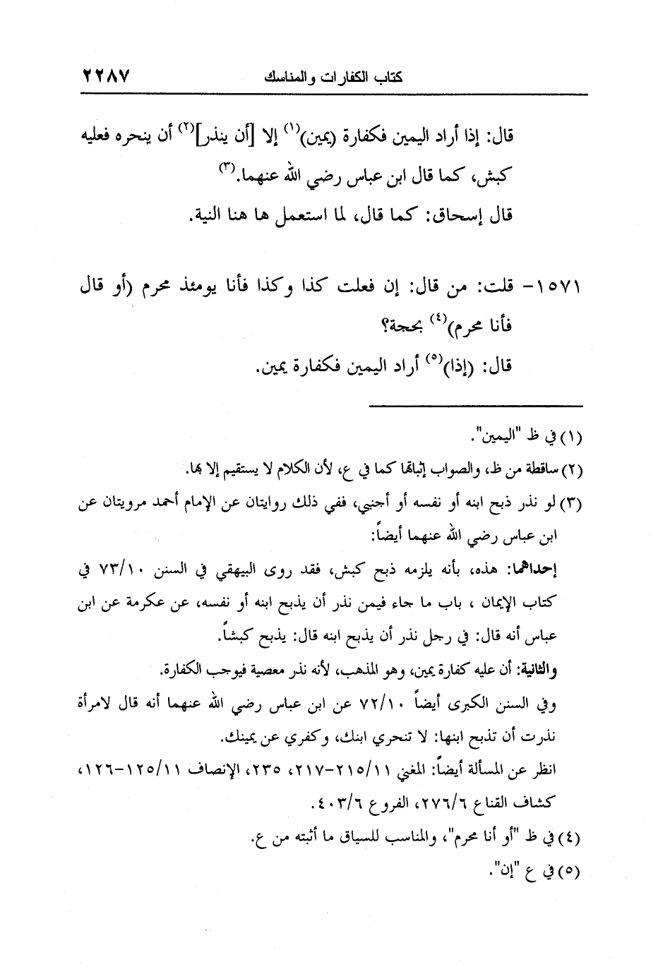 قال: إذا أراد اليمين فكفارة (يمين) 1 إلا [أن ينذر] 2 أن ينحره فعليه كبش، كما قال ابن عباس رضي الله عنهما.3