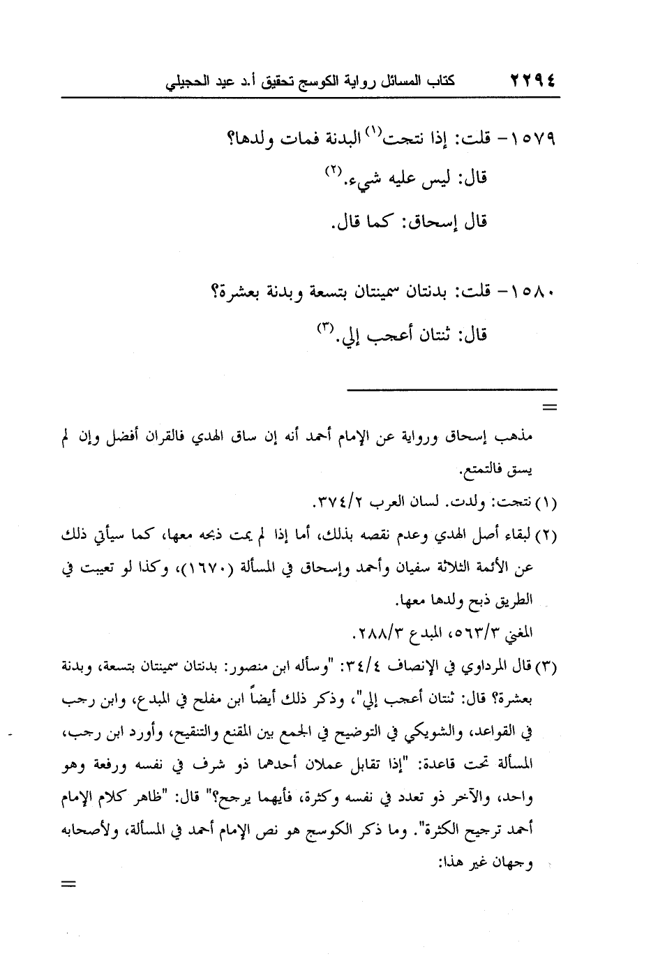 3 قال المرداوي في الإنصاف 4/34: "وسأله ابن منصور: بدنتان سمينتان بتسعة، وبدنة بعشرة؟ قال: ثنتان أعجب إلي"، وذكر ذلك أيضاً ابن مفلح في المبدع، وابن رجب في القواعد، والشويكي في التوضيح في الجمع بين المقنع والتنقيح، وأورد ابن رجب، المسألة تحت قاعدة: "إذا تقابل عملان أحدهما ذو شرف في نفسه ورفعة وهو واحد، والآخر ذو تعدد في نفسه وكثرة، فأيهما يرجح؟ " قال: "ظاهر كلام الإمام أحمد ترجيح الكثرة". وما ذكر الكوسج هو نص الإمام أحمد في المسألة، ولأصحابه وجهان غير هذا: