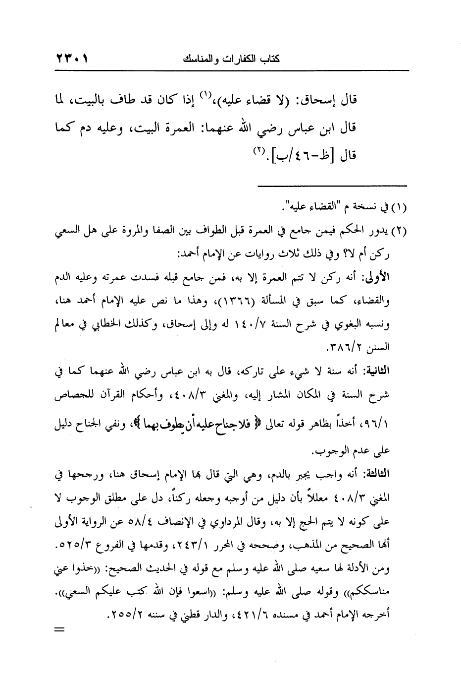 الأولى: أنه ركن لا تتم العمرة إلا به، فمن جامع قبله فسدت عمرته وعليه الدم والقضاء، كما سبق في المسألة (1366) ، وهذا ما نص عليه الإمام أحمد هنا، ونسبه البغوي في شرح السنة 7/140 له وإلى إسحاق، وكذلك الخطابي في معالم السنن 2/386.