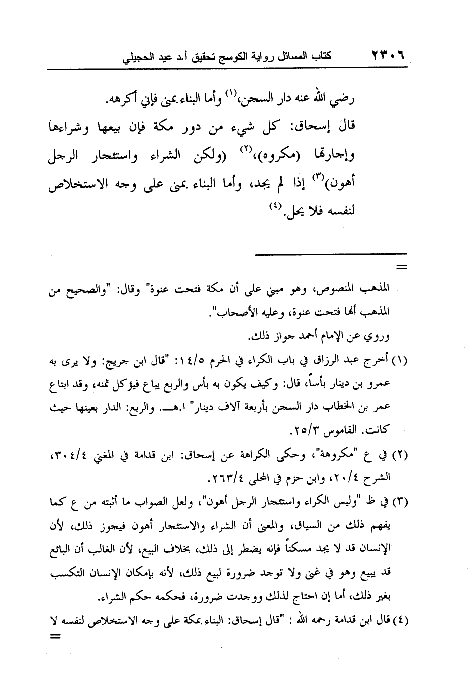 4 قال ابن قدامة رحمه الله: "قال إسحاق: البناء بمكة على وجه الاستخلاص لنفسه لا يحل" ا. هـ. المغني 4/305، الشرح الكبير 4/21.