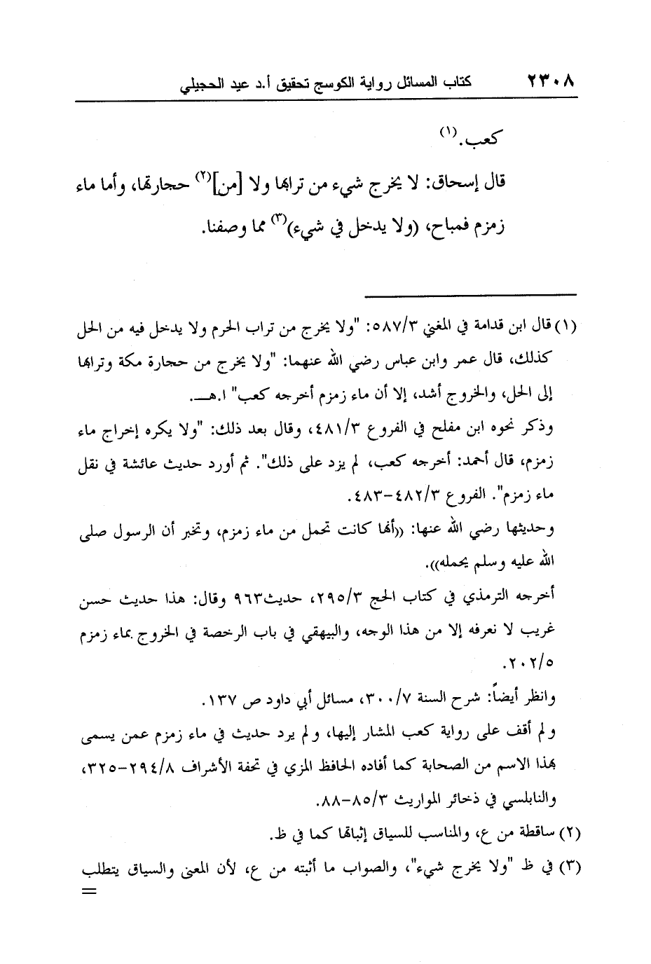 وذكر نحوه ابن مفلح في الفروع 3/481، وقال بعد ذلك: "ولا يكره إخراج ماء زمزم، قال أحمد: أخرجه كعب، [] لم يزد على ذلك". ثم أورد حديث عائشة في نقل ماء زمزم". الفروع 3/482-483.