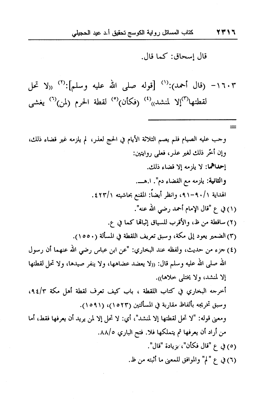 [1603-] (قال أحمد) :1 [قوله صلى الله عليه وسلم] :2 "لا تحل لقطتها3إلا لمنشد"4 (فكأن) 5 لقطة الحرم (لمن) 6 يغشى