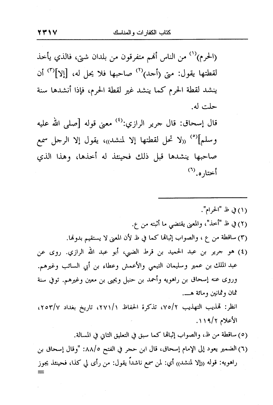 6 الضمير يعود إلى الإمام إسحاق، قال ابن حجر في الفتح 5/88: "وقال إسحاق بن راهويه: قوله "إلا لمنشد" أي: لمن سمع ناشداً يقول: من رأى لي كذا، فحينئذ يجوز لواجد اللقطة أن يعرفها ليردها على صاحبها، وهو أضيق من قول الجمهور لأنه قيده بحاله للمعرف دون حاله" ا. هـ.