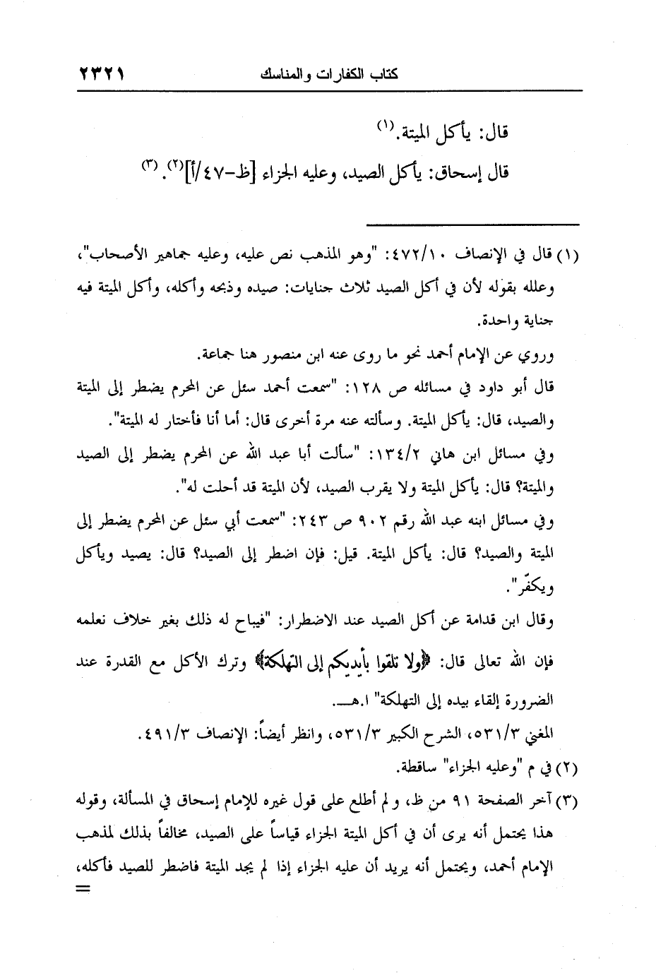 3 آخر الصفحة 91 من ظ، ولم أطلع على قول غيره للإمام إسحاق في المسألة، وقوله هذا يحتمل أنه يرى أن في أكل الميتة الجزاء قياساً على الصيد، مخالفاً بذلك لمذهب الإمام أحمد، ويحتمل أنه يريد أن عليه الجزاء إذا لم يجد الميتة فاضطر للصيد فأكله، كما نقل نحو ذلك عن الإمام أحمد ابنه عبد الله، كما سبقت الإشارة إليه.