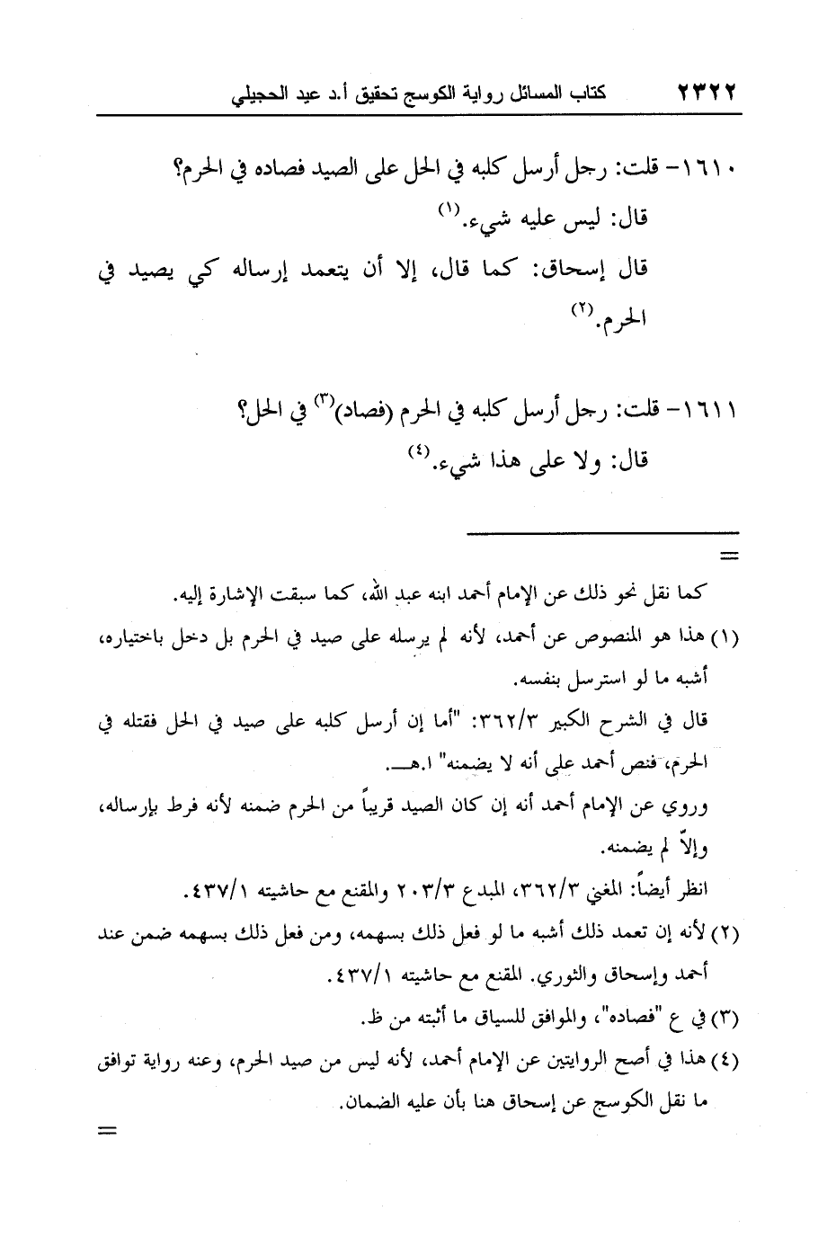4 هذا في أصح الروايتين عن الإمام أحمد، لأنه ليس من صيد الحرم، وعنه رواية توافق ما نقل الكوسج عن إسحاق هنا بأن عليه الضمان.