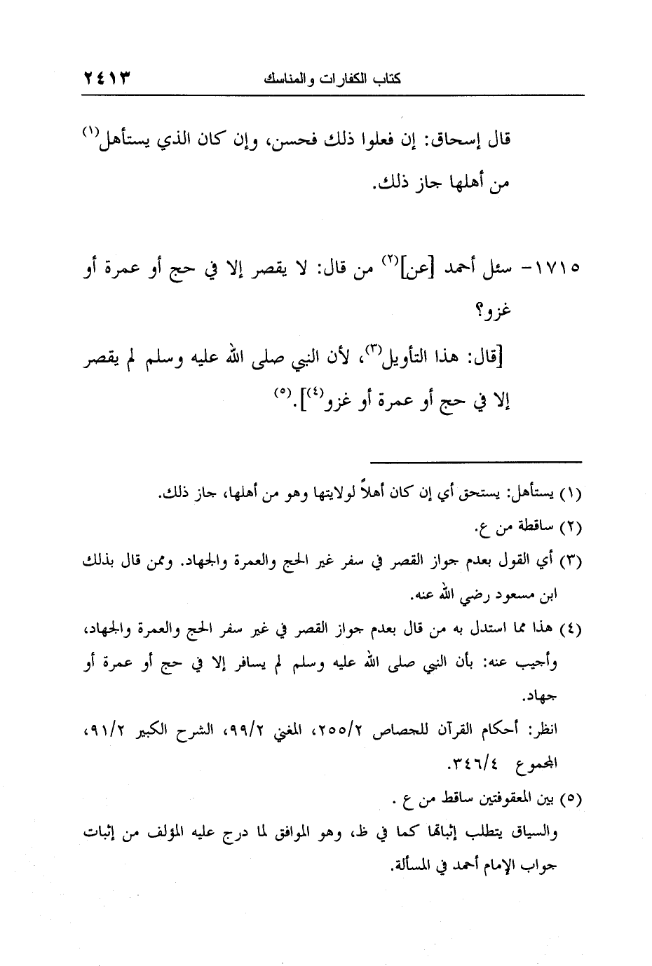 [1715-] سئل أحمد [عن] 2 من قال: لا يقصر إلا في حج أو عمرة أو غزو؟