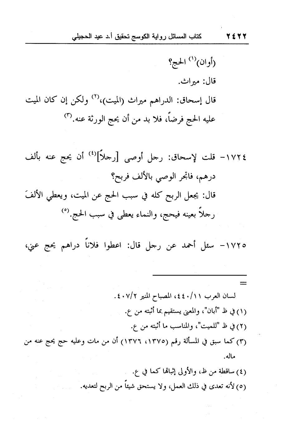 قال إسحاق: الدراهم ميراث (الميت) ،2 ولكن إن كان الميت عليه الحج فرضاً، فلا بد من أن يحج الورثة عنه.3
