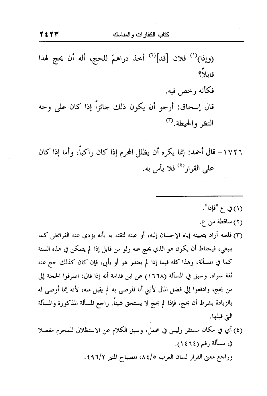 [1726-] قال أحمد: إنما يكره أن يظلل المحرم إذا كان راكباً، وأما إذا كان على القرار4 فلا بأس به.