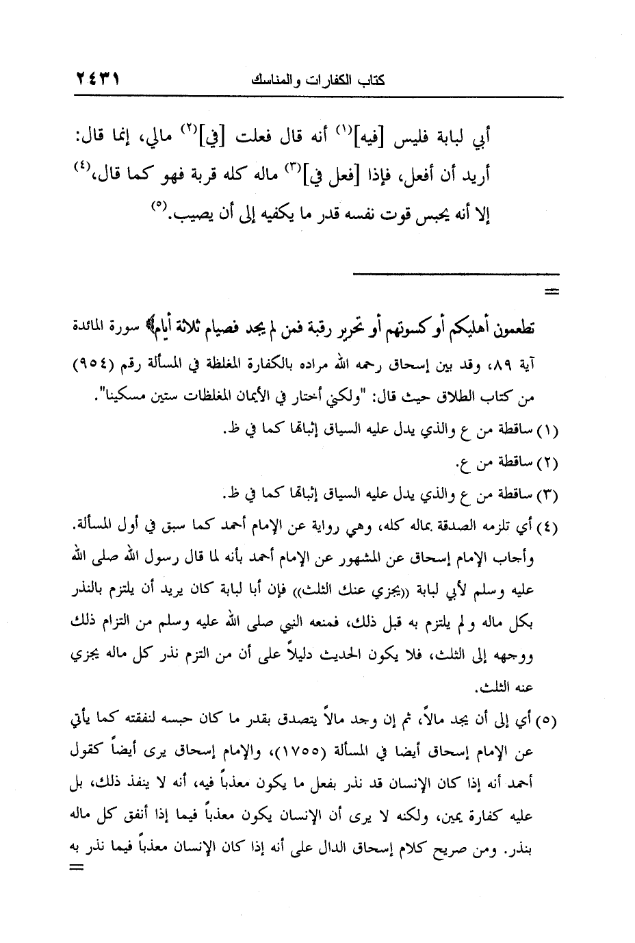 5 أي إلى أن يجد مالاً، ثم إن وجد مالاً يتصدق بقدر ما كان حبسه لنفقته كما يأتي عن الإمام إسحاق أيضا في المسألة (1755) ، والإمام إسحاق يرى أيضاً كقول أحمد أنه إذا كان الإنسان قد نذر بفعل ما يكون معذباً فيه، أنه لا ينفذ ذلك، بل عليه كفارة يمين، ولكنه لا يرى أن الإنسان يكون معذباً فيما إذا أنفق كل ماله بنذر. ومن صريح كلام إسحاق الدال على أنه إذا كان الإنسان معذباً فيما نذر به لا ينفذه، قوله فيمن نذر ثلاثين حجة، لا يكون هذا النذر أبداً في طاعة، عليه كفارة مغلظة وذلك في المسألة الآتية رقم (1762) .