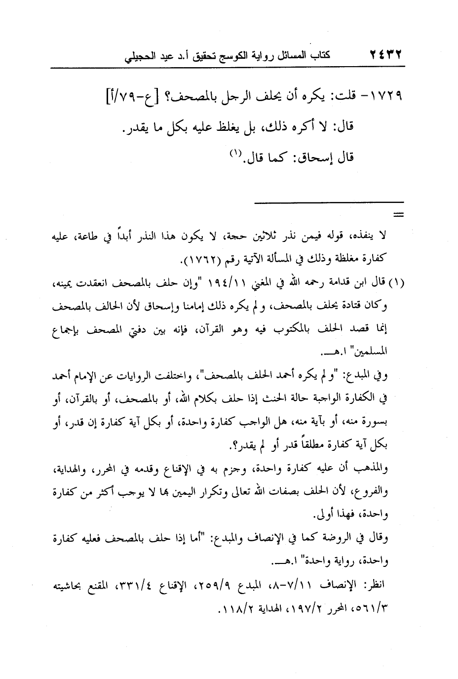 [1729-] قلت: يكره أن يحلف الرجل بالمصحف؟ [ع-79/أ]