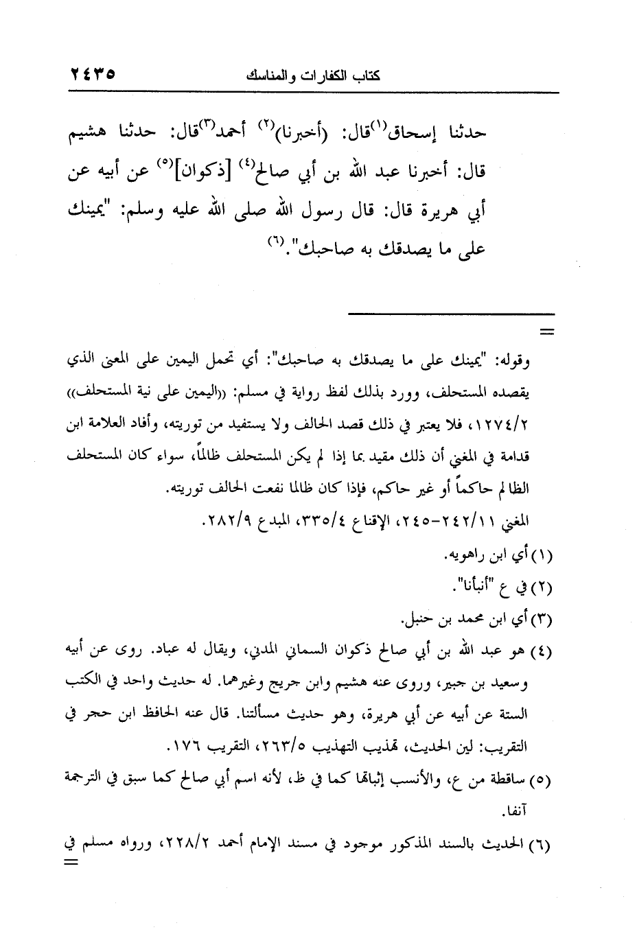 6 الحديث بالسند المذكور موجود في مسند الإمام أحمد 2/228، ورواه مسلم في باب يمين الحالف على نية المستحلف 2/1274، حديث 1653 عن يحيى بن يحيى وعمرو الناقد عن هشيم، وأبو داود في باب المعارض في اليمين 3/572، حديث3255 عن عمرو بن عون عن هشيم، والترمذي في كتاب الأحكام، باب ما جاء أن اليمين على ما يصدقه صاحبه 3/636، حديث 1354 عن قتيبة وأحمد بن منيع قالا: حدثنا هشيم، وابن ماجة في باب من ورّى في يمينه 1/686، حديث 1221 عن عمرو بن رافع عن هشيم، والدارمي في الرجل يحلف على الشيء وهو يورّك على يمينه 1/583، عن عثمان بن محمد بن هشيم، والتوريك في اليمين: أن ينوي الحالف غير ما نواه المستحلف. هامش على سنن الدارمي 583.