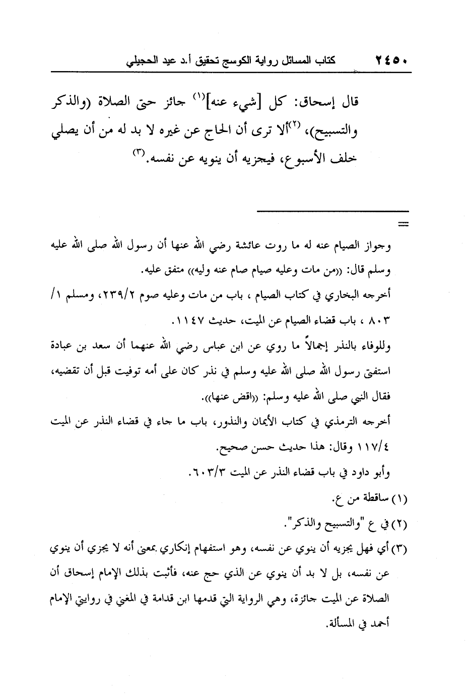 3 أي فهل يجزيه أن ينوي عن نفسه، وهو استفهام إنكاري بمعنى أنه لا يجزي أن ينوي عن نفسه، بل لا بد أن ينوي عن الذي حج عنه، فأثبت بذلك الإمام إسحاق أن الصلاة عن الميت جائزة، وهي الرواية التي قدمها ابن قدامة في المغني في روايتي الإمام أحمد في المسألة.