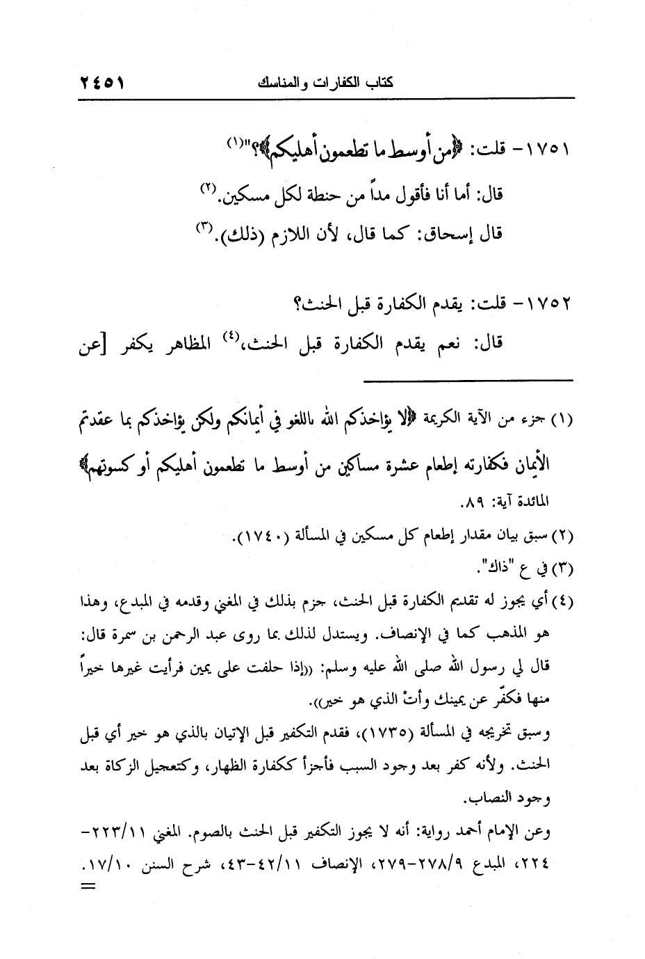 [] وعن الإمام أحمد رواية: أنه لا يجوز التكفير قبل الحنث بالصوم. المغني 11/223-224، المبدع 9/278-[279،] الإنصاف 11/42-43، شرح السنن 10/17. وقد سبقت الإشارة إلى هذه المسألة في المسألة رقم (1628) .