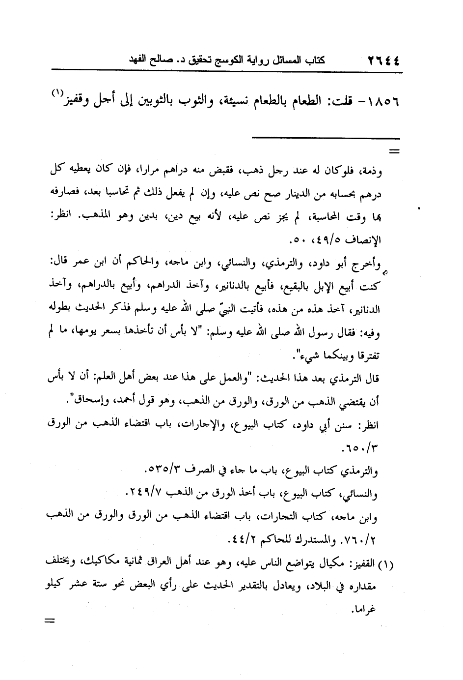 1 القفيز: مكيال يتواضع الناس عليه، وهو عند أهل العراق ثمانية مكاكيك، ويختلف مقداره في البلاد، ويعادل بالتقدير الحديث على رأي البعض نحو ستة عشر كيلو غراما.