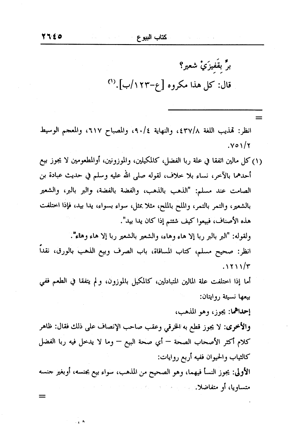 1 كل مالين اتفقا في علة ربا الفضل، كالمكيلين، والموزونين، أوالمطعومين لا يجوز بيع أحدهما بالآخر، نساء بلا خلاف، لقوله صلى الله عليه وسلم في حديث عبادة بن الصامت عند مسلم: "الذهب بالذهب، والفضة بالفضة، والبر بالبر، والشعير بالشعير، والتمر بالتمر، والملح بالملح، مثلا بمثل، سواء بسواء، يدا بيد، فإذا اختلفت هذه الأصناف، فبيعوا كيف شئتم إذا كان يدا بيد".