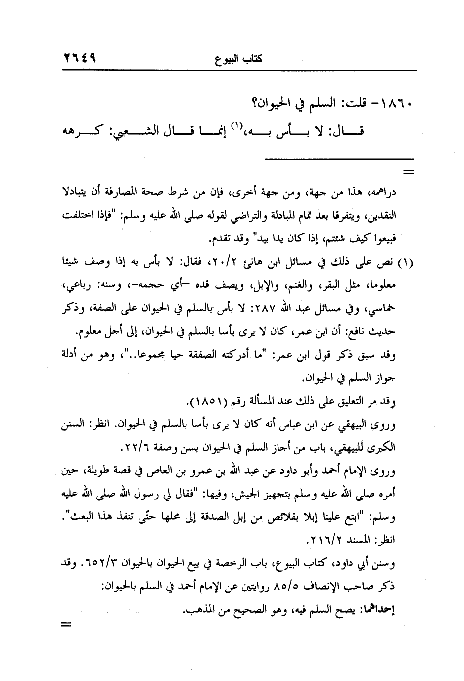 1 نص على ذلك في مسائل ابن هانئ 2/20، فقال: لا بأس به إذا وصف شيئا معلوما، مثل البقر، والغنم، والإبل، ويصف قده –أي حجمه-، وسنه: رباعي، خماسي، وفي مسائل عبد الله 287: لا بأس بالسلم في الحيوان على الصفة، وذكر حديث نافع: أن ابن عمر، كان لا يرى بأسا بالسلم في الحيوان، إلى أجل معلوم.