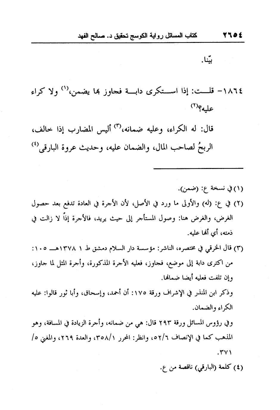 [1864-] قلت: إذا استكرى دابة فجاوز بها يضمن،1 ولا كراء عليه؟ 2قال: له الكراء، وعليه ضمانه،3 أليس المضارب إذا خالف، الربحُ لصاحب المال، والضمان عليه، وحديث عروة البارقى4