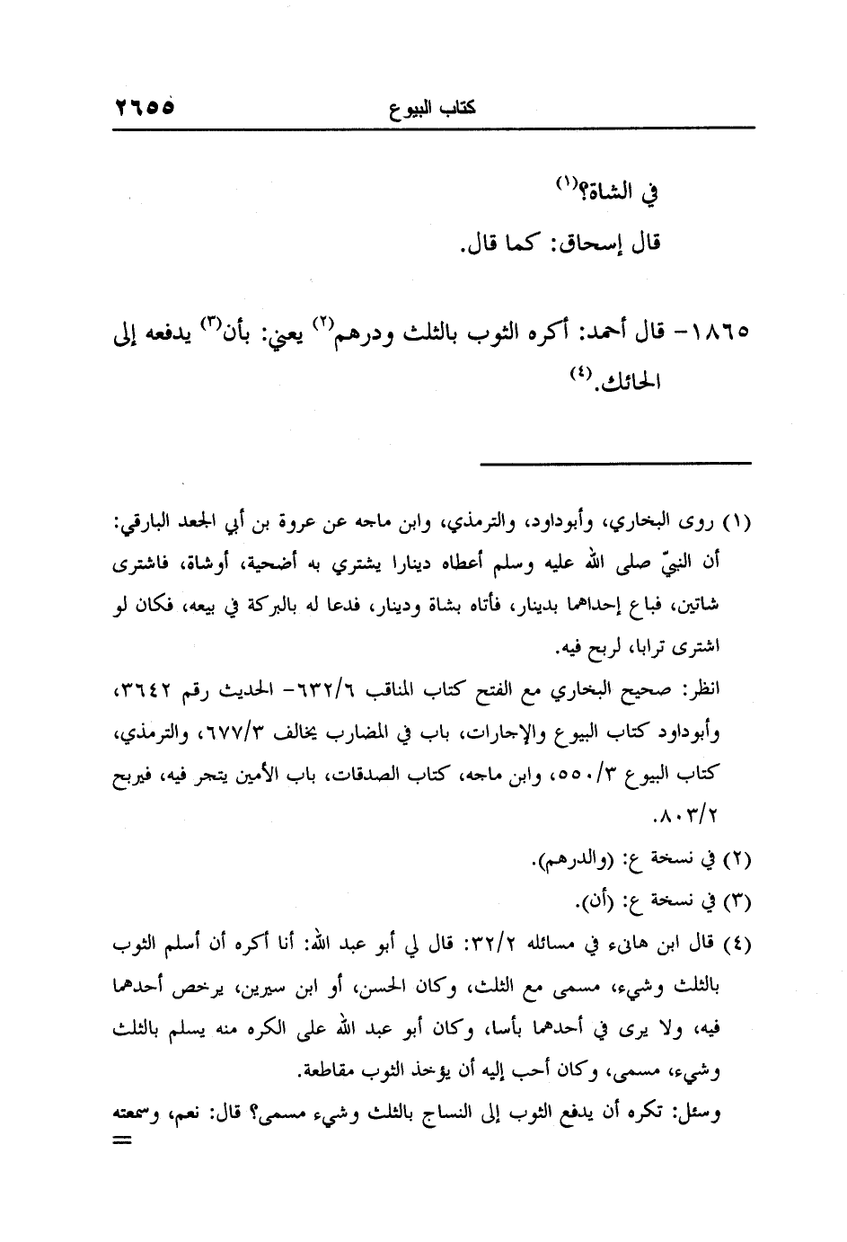 [] في الشاة؟ 1قال إسحاق: كما قال.1865- قال أحمد: أكره الثوب بالثلث ودرهم2 يعني: بأن3 يدفعه إلى الحائك.4