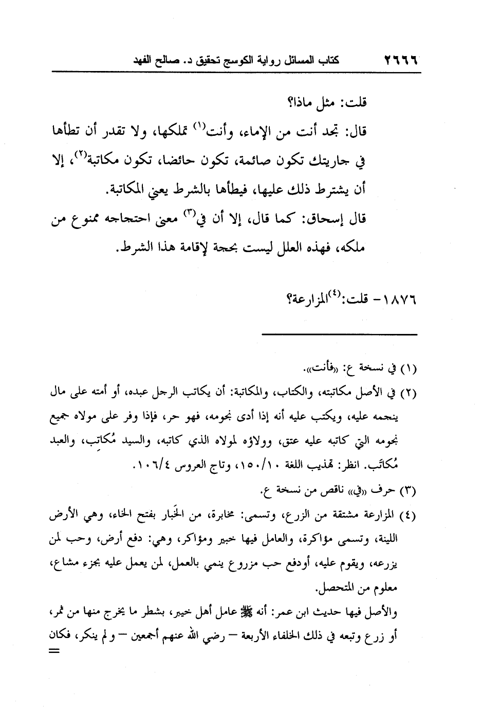 2 في الأصل مكاتبته، والكتاب، والمكاتبة: أن يكاتب الرجل عبده، أو أمته على مال ينجمه عليه، ويكتب عليه أنه إذا أدى نجومه، فهو حر، فإذا وفر على مولاه جميع نجومه التي كاتبه عليه عتق، وولاؤه لمولاه الذي كاتبه، والسيد مُكاتِب، والعبد مُكاتَب. انظر: تهذيب اللغة 10/150، وتاج العروس 4/106.