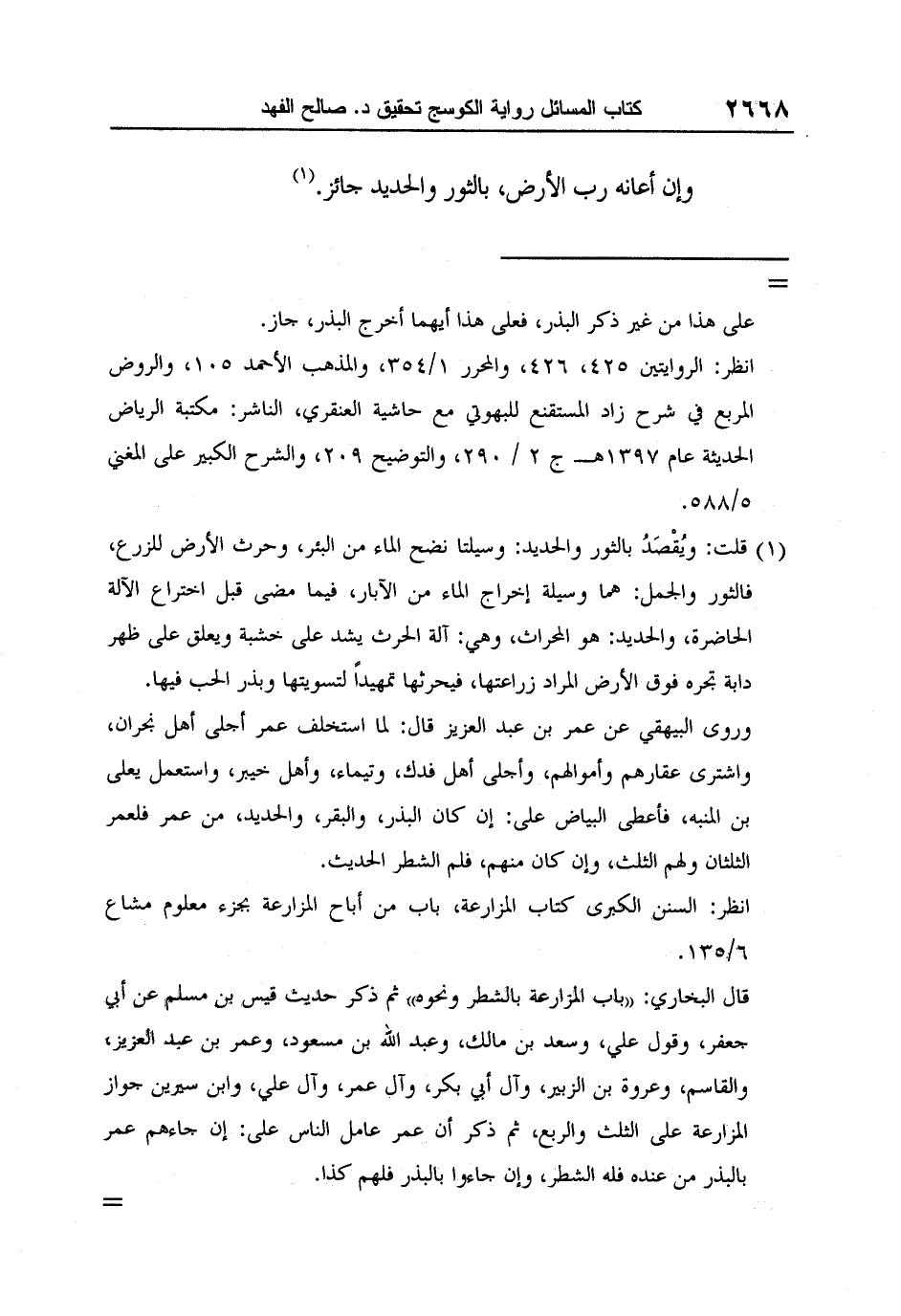 1 قلت: ويُقْصَدُ بالثور والحديد: وسيلتا نضح الماء من البئر، وحرث الأرض للزرع، فالثور والجمل: هما وسيلة إخراج الماء من الآبار، فيما مضى قبل اختراع الآلة الحاضرة، والحديد: هو المحراث، وهي: آلة الحرث يشد على خشبة ويعلق على ظهر دابة تجره فوق الأرض المراد زراعتها، فيحرثها تمهيداً لتسويتها وبذر الحب فيها.