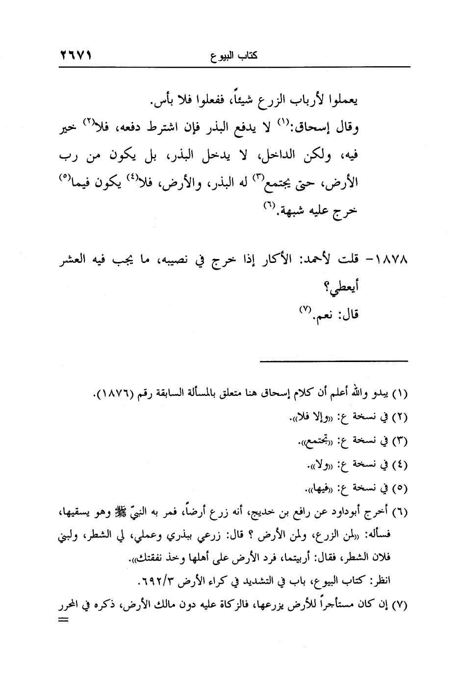 1 يبدو والله أعلم أن كلام إسحاق هنا متعلق بالمسألة السابقة رقم (1876) .