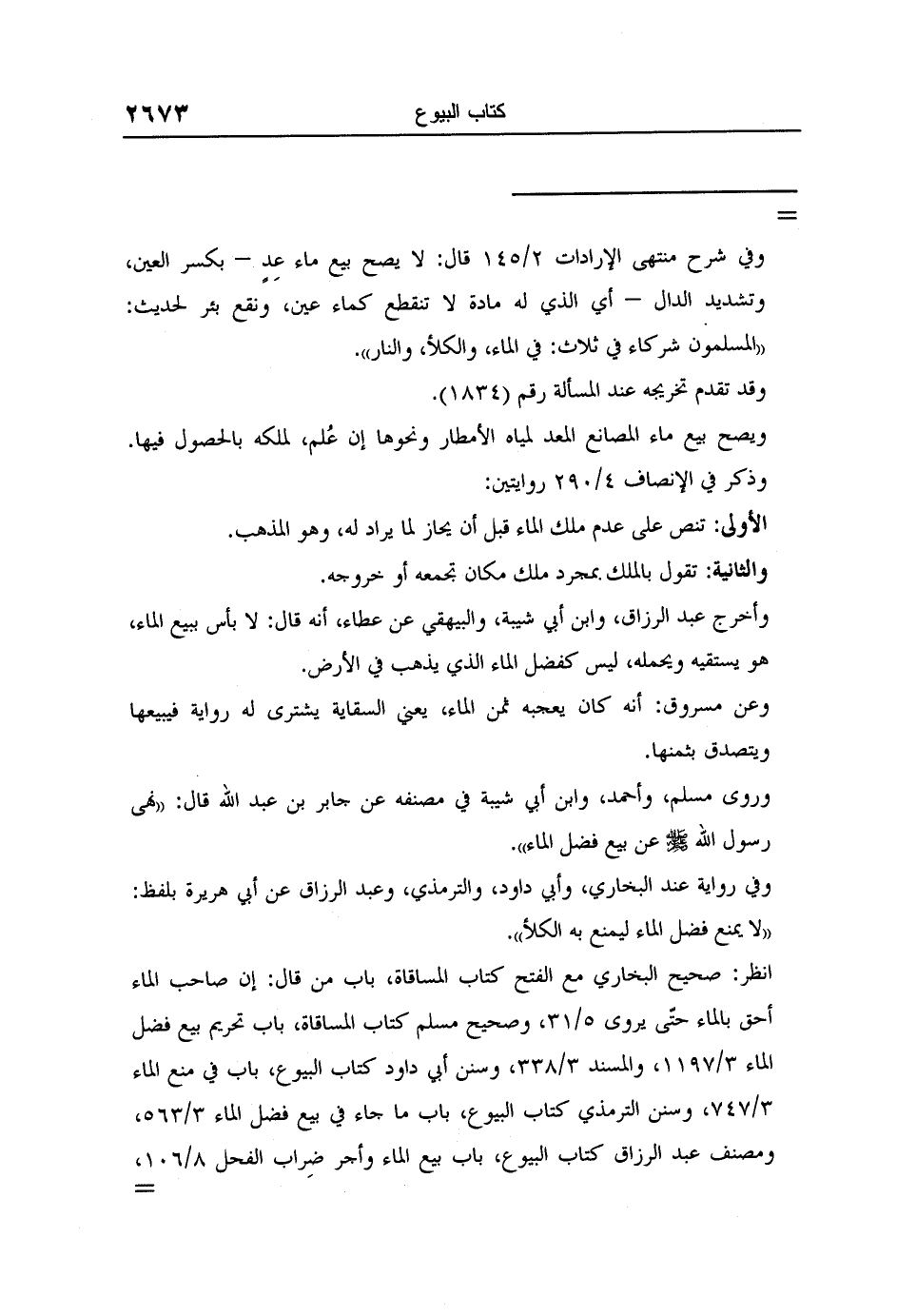 == وفي شرح منتهى الإرادات 2/145 قال: لا يصح بيع ماء عِدٍ – بكسر العين، وتشديد الدال – أي الذي له مادة لا تنقطع كماء عين، ونقع بئر لحديث: "المسلمون شركاء في ثلاث: في الماء، والكلأ، والنار".