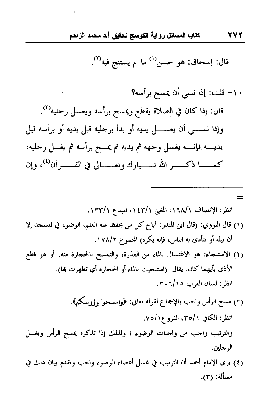 4 يرى الإمام أحمد أن الترتيب في غسل أعضاء الوضوء واجب وتقدم بيان ذلك في مسألة: (3) .