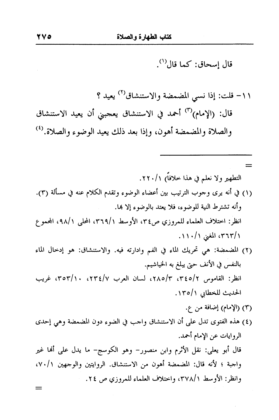 قال: (الإمام) 3 أحمد في الاستنشاق يعجبني أن يعيد الاستنشاق والصلاة والمضمضة أهون، وإذا بعد ذلك يعيد الوضوء والصلاة.4