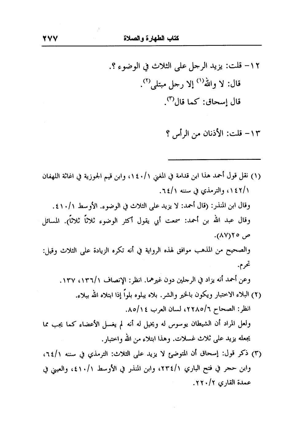 وقال عبد الله بن أحمد: سمعت أبي يقول أكثر الوضوء ثلاثاً ثلاثاً) . المسائل ص 25 (87) .