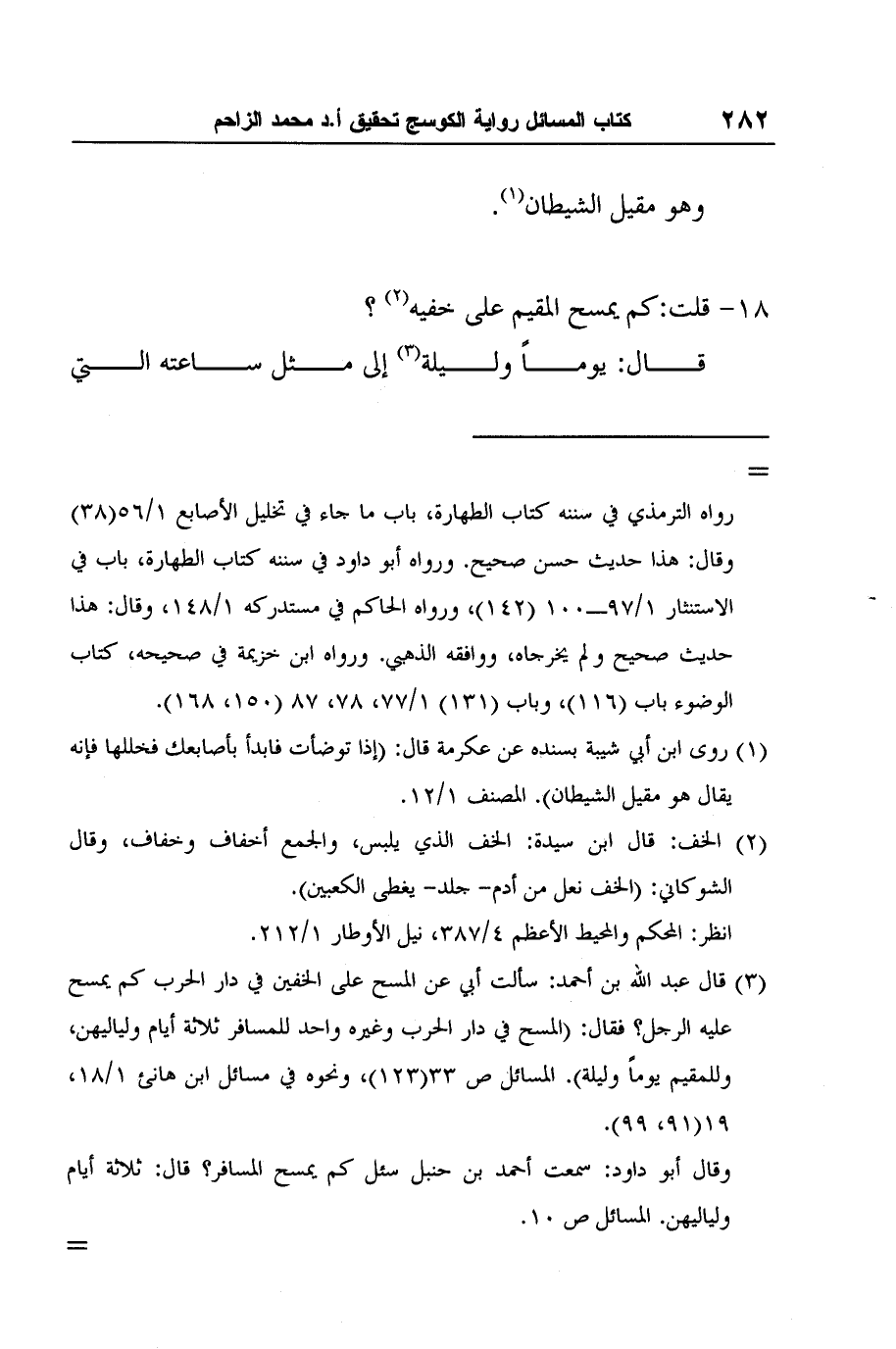 3 قال عبد الله بن أحمد: سألت أبي عن المسح على الخفين في دار الحرب كم يمسح عليه الرجل؟ فقال: (المسح في دار الحرب وغيره واحد للمسافر ثلاثة أيام ولياليهن، وللمقيم يوماً وليلة) . المسائل ص 33 (123) ، ونحوه في مسائل ابن هانئ 1/18، 19 (91، 99) .