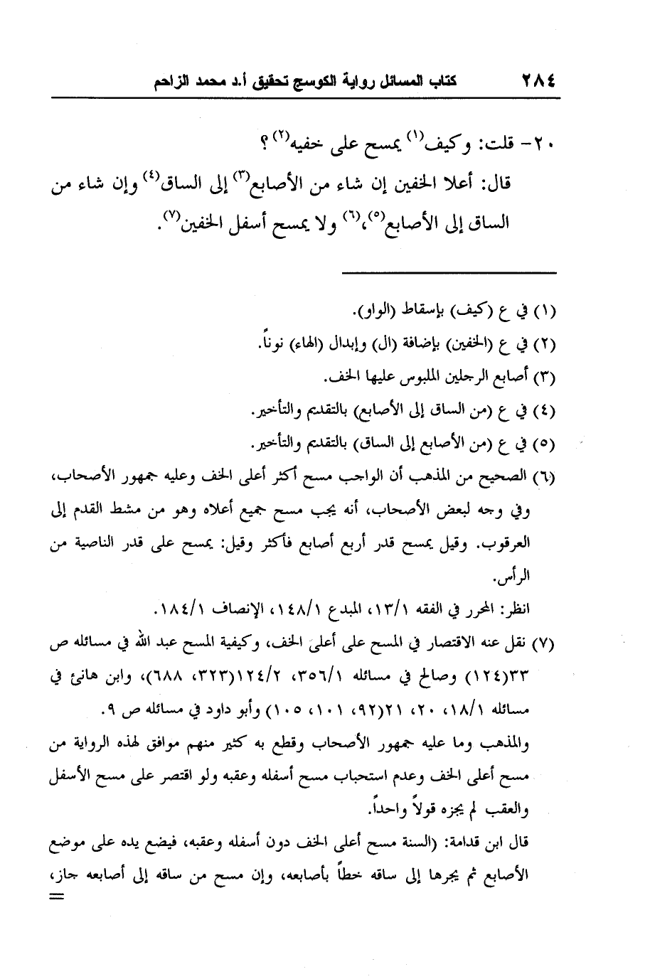 7 نقل عنه الاقتصار في المسح على أعلى الخف، وكيفية المسح عبد الله في مسائله ص 33 (124) وصالح في مسائله 1/356، 2/124 (323، 688) ، وابن هانئ في مسائله 1/18، 20، 21 (92، 101، 105) وأبو داود في مسائله ص 9.