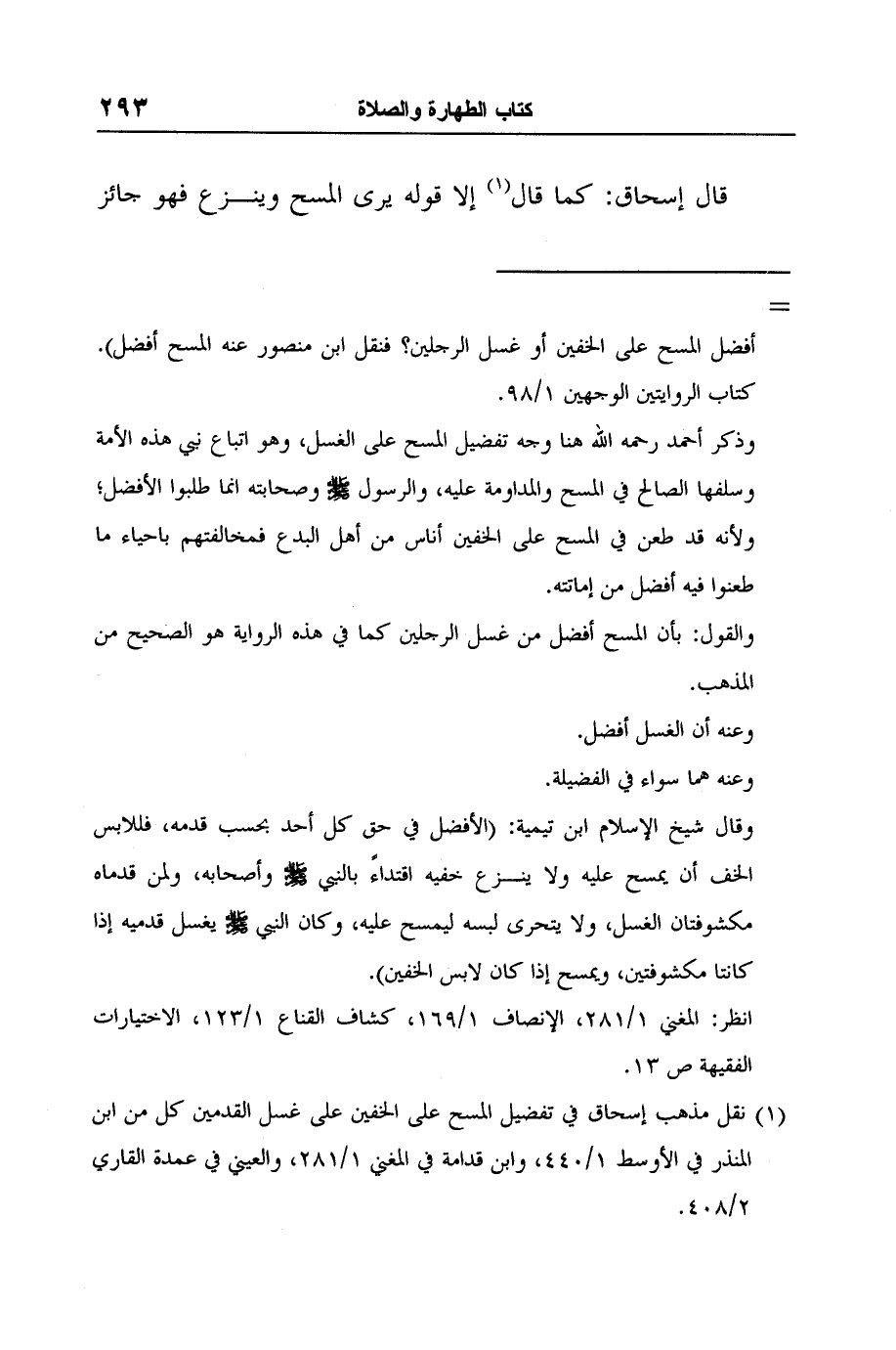 1 نقل مذهب إسحاق في تفضيل المسح على الخفين على غسل القدمين كل من ابن المنذر في الأوسط 1/440، وابن قدامة في المغني 1/281، والعيني في عمدة القاري 2/408.
