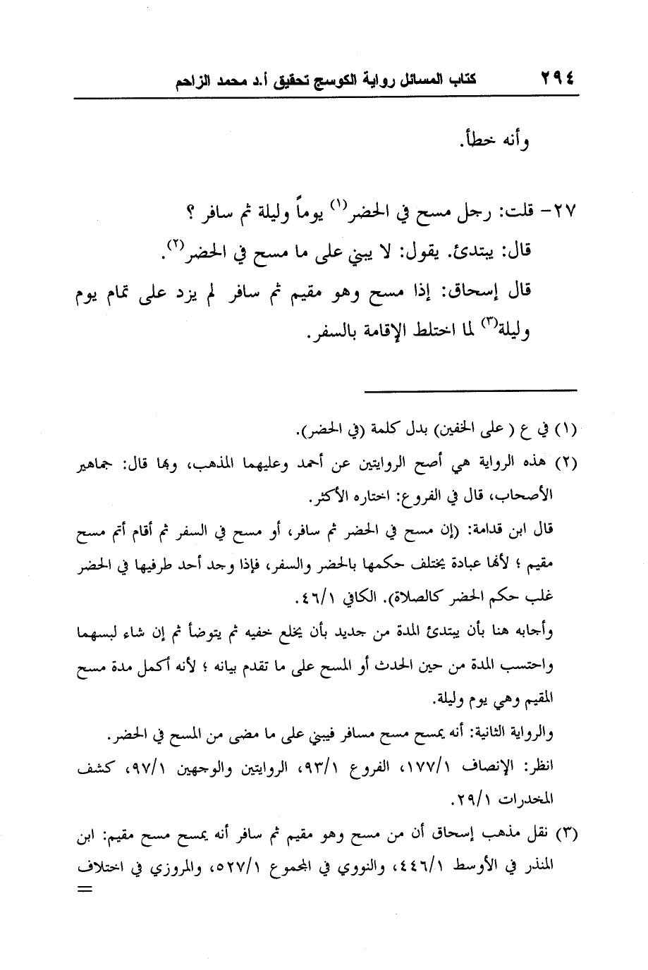 3 نقل مذهب إسحاق أن من مسح وهو مقيم ثم سافر أنه يمسح مسح مقيم: ابن المنذر في الأوسط 1/446، والنووي في المجموع 1/527، والمروزي في اختلاف العلماء ص31، وابن قدامة في الغني 1/291.