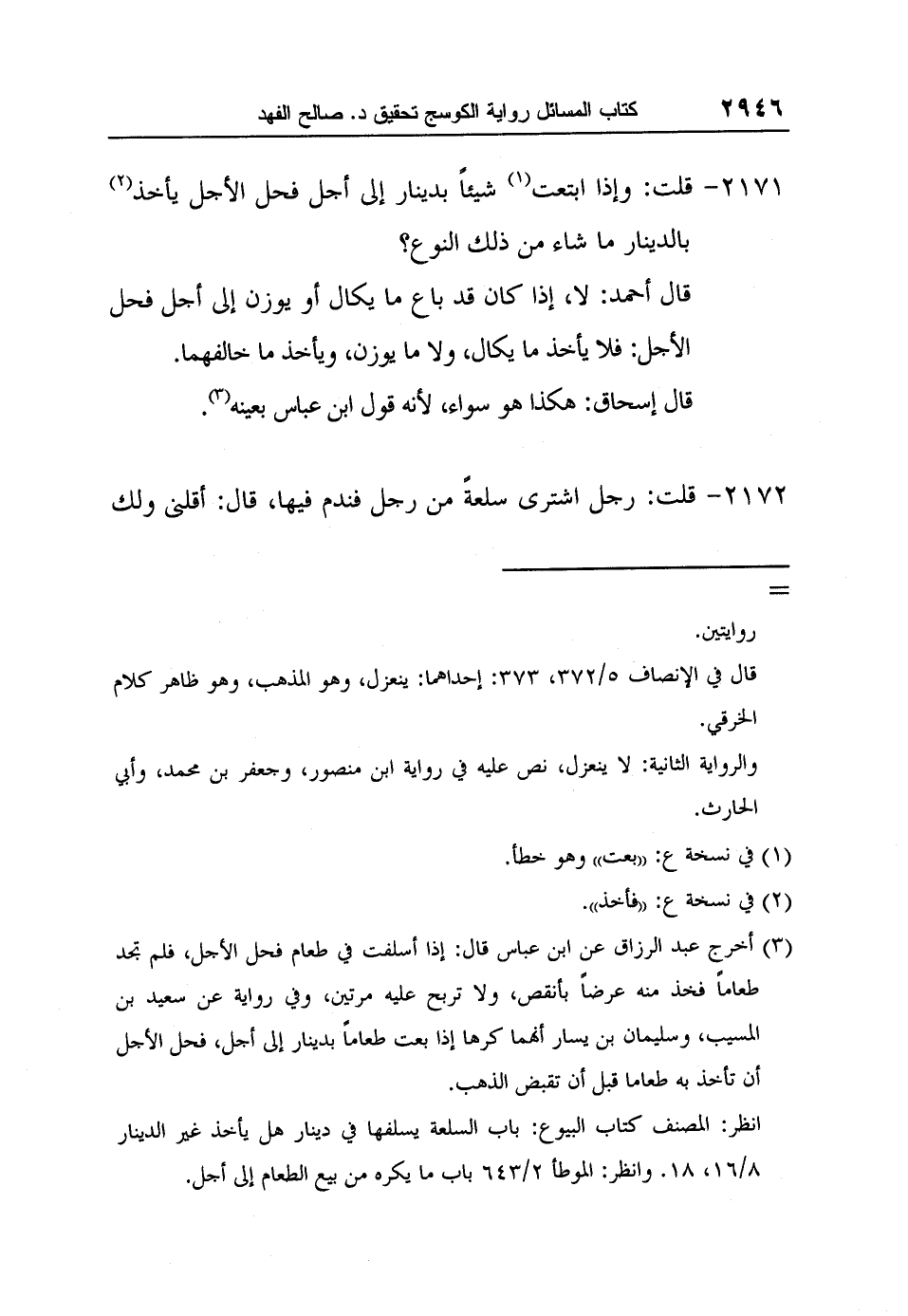 3 أخرج عبد الرزاق عن ابن عباس قال: إذا أسلفت في طعام فحل الأجل، فلم تجد طعاماً فخذ منه عرضاً بأنقص، ولا تربح عليه مرتين، وفي رواية عن سعيد بن المسيب، وسليمان بن يسار أنهما كرها إذا بعت طعاماً بدينار إلى أجل، فحل الأجل أن تأخذ به طعاما قبل أن تقبض الذهب.