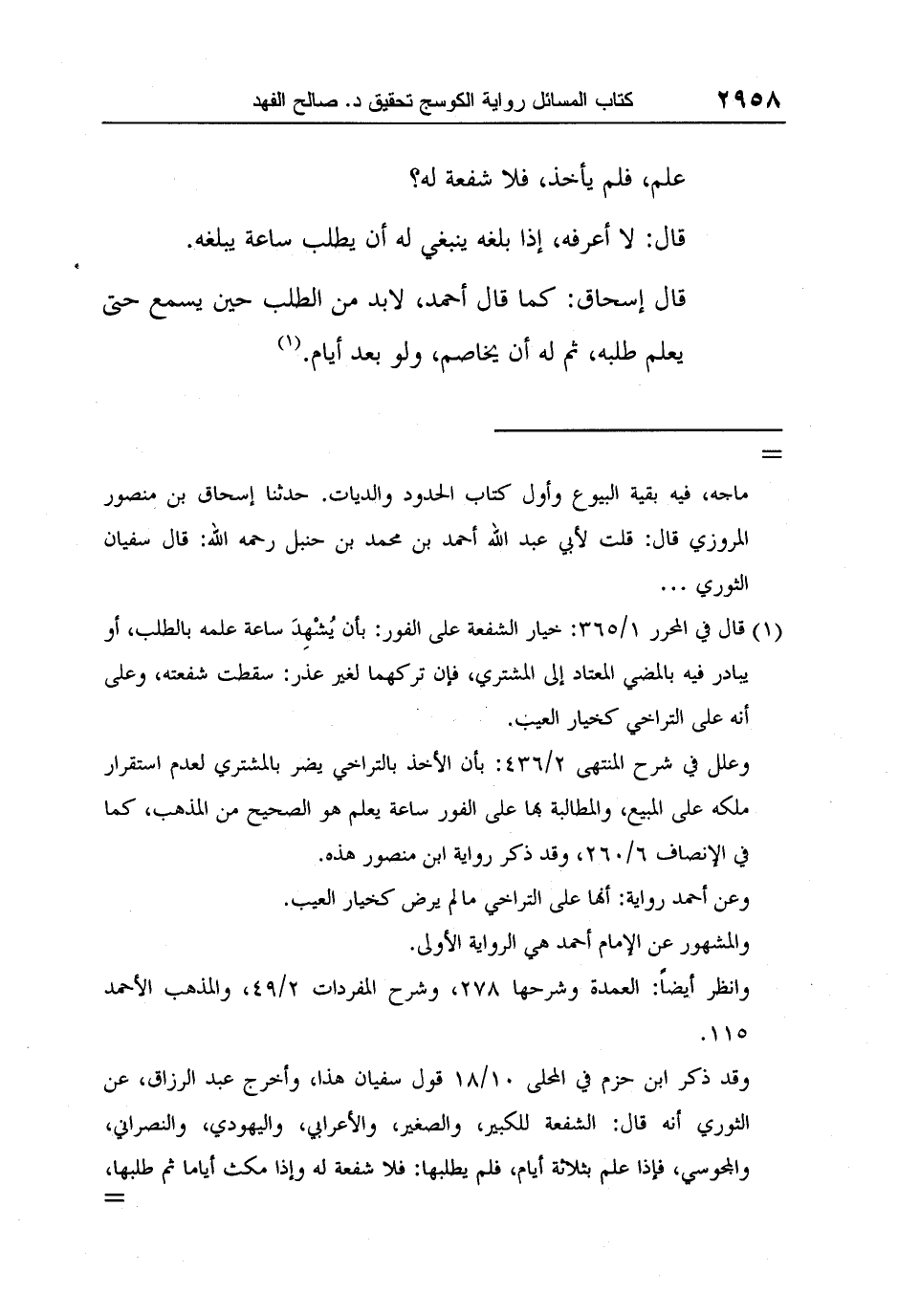 وعلل في شرح المنتهى 2/436: بأن الأخذ بالتراخي يضر بالمشتري لعدم استقرار ملكه على المبيع، والمطالبة بها على الفور ساعة يعلم هو الصحيح من المذهب، كما في الإنصاف 6/260، وقد ذكر رواية ابن منصور هذه.
