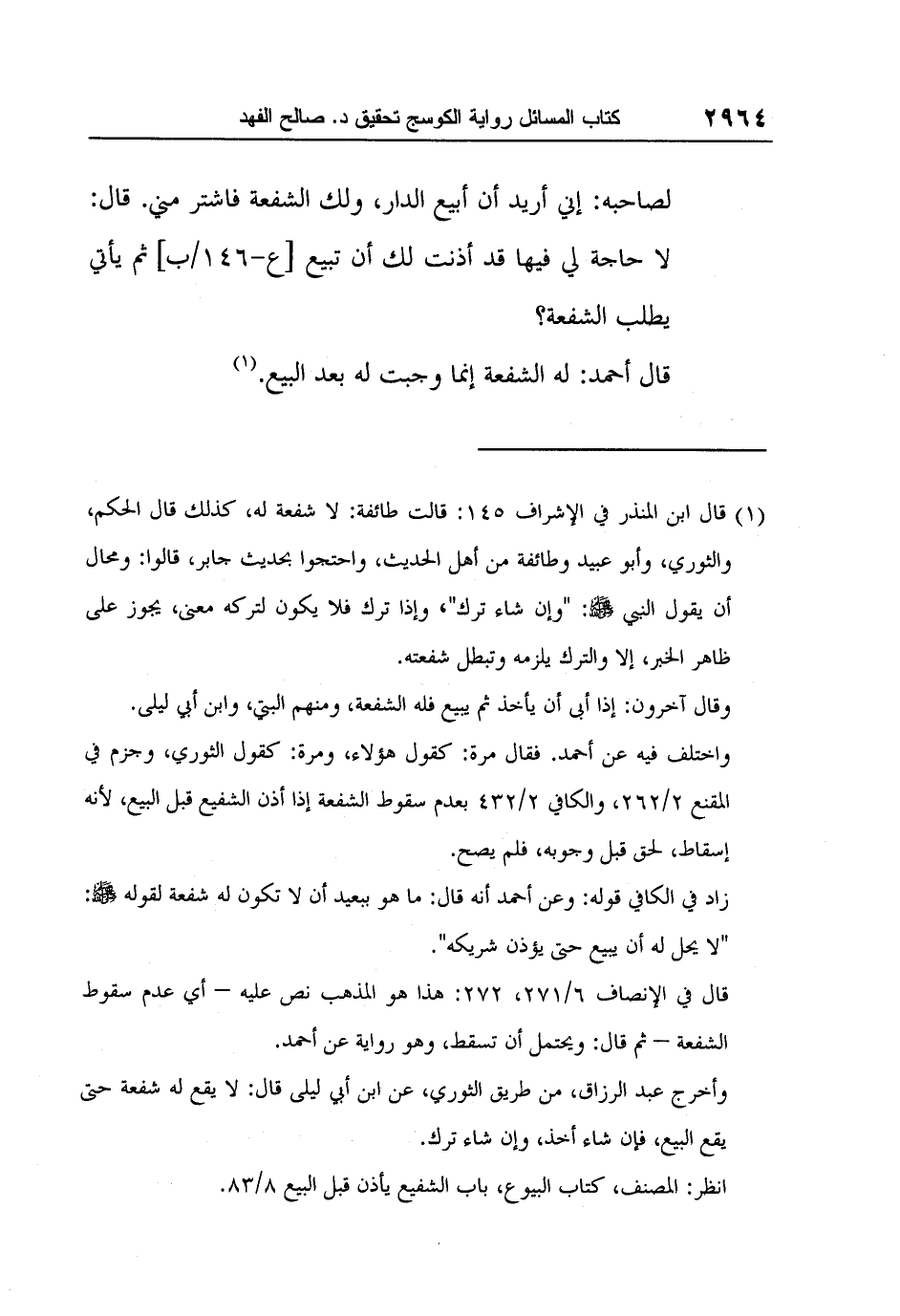 1 قال ابن المنذر في الإشراف 145: قالت طائفة: لا شفعة له، كذلك قال الحكم، والثوري، وأبو عبيد وطائفة من أهل الحديث، واحتجوا بحديث جابر، قالوا: ومحال أن يقول النبي صلى الله عليه وسلم: "وإن شاء ترك"، وإذا ترك فلا يكون لتركه معنى، يجوز على ظاهر الخبر، إلا والترك يلزمه وتبطل شفعته.