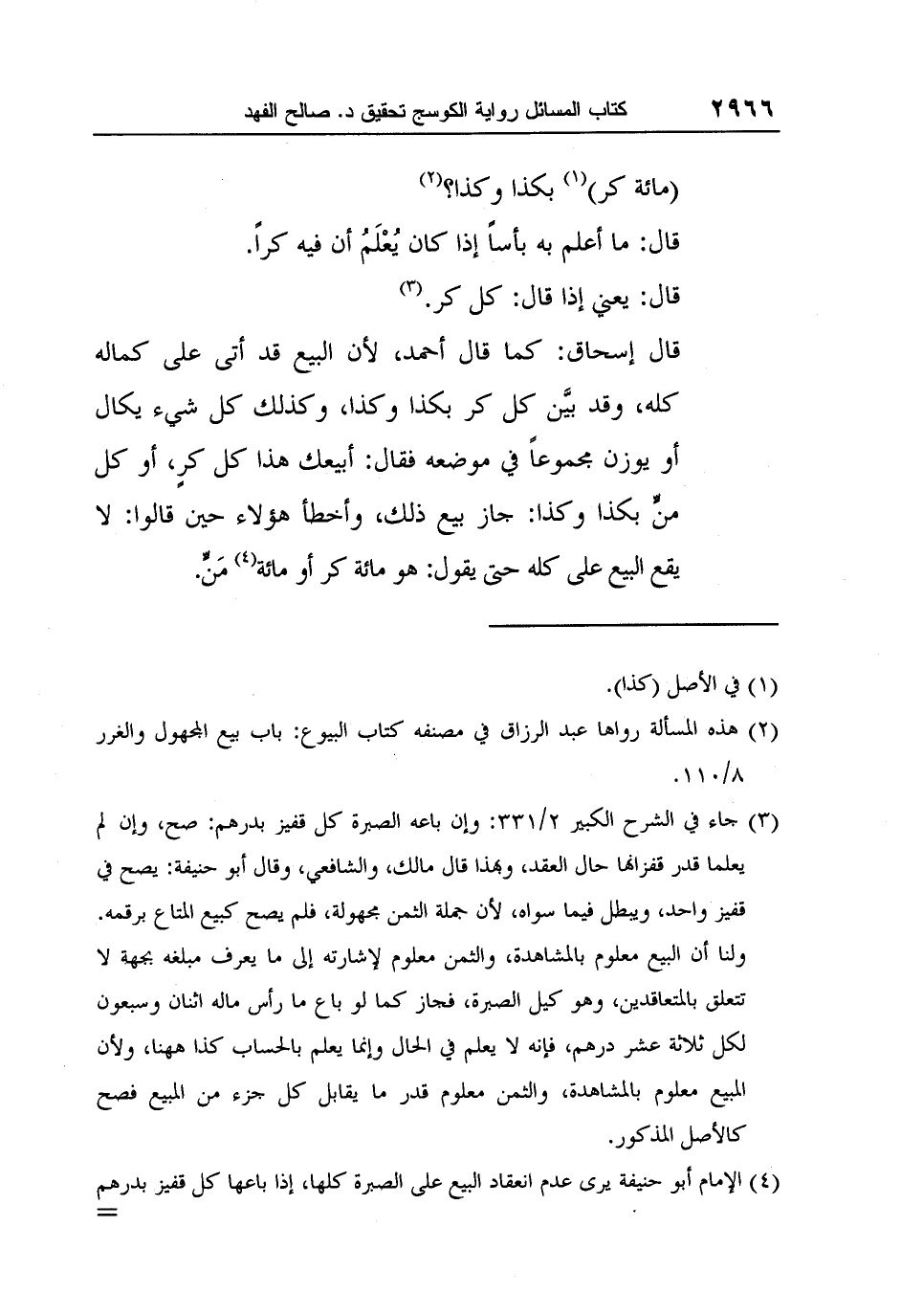 قال إسحاق: كما قال أحمد، لأن البيع قد أتى على كماله كله، وقد بيَّن كل كر بكذا وكذا، وكذلك كل شيء يكال أو يوزن مجموعاً في موضعه فقال: أبيعك هذا كل كرٍ، أو كل منٍّ بكذا وكذا: جاز بيع ذلك، وأخطأ هؤلاء حين قالوا: لا يقع البيع على كله حتى يقول: هو مائة كر أو مائة4 مَنٍّ.