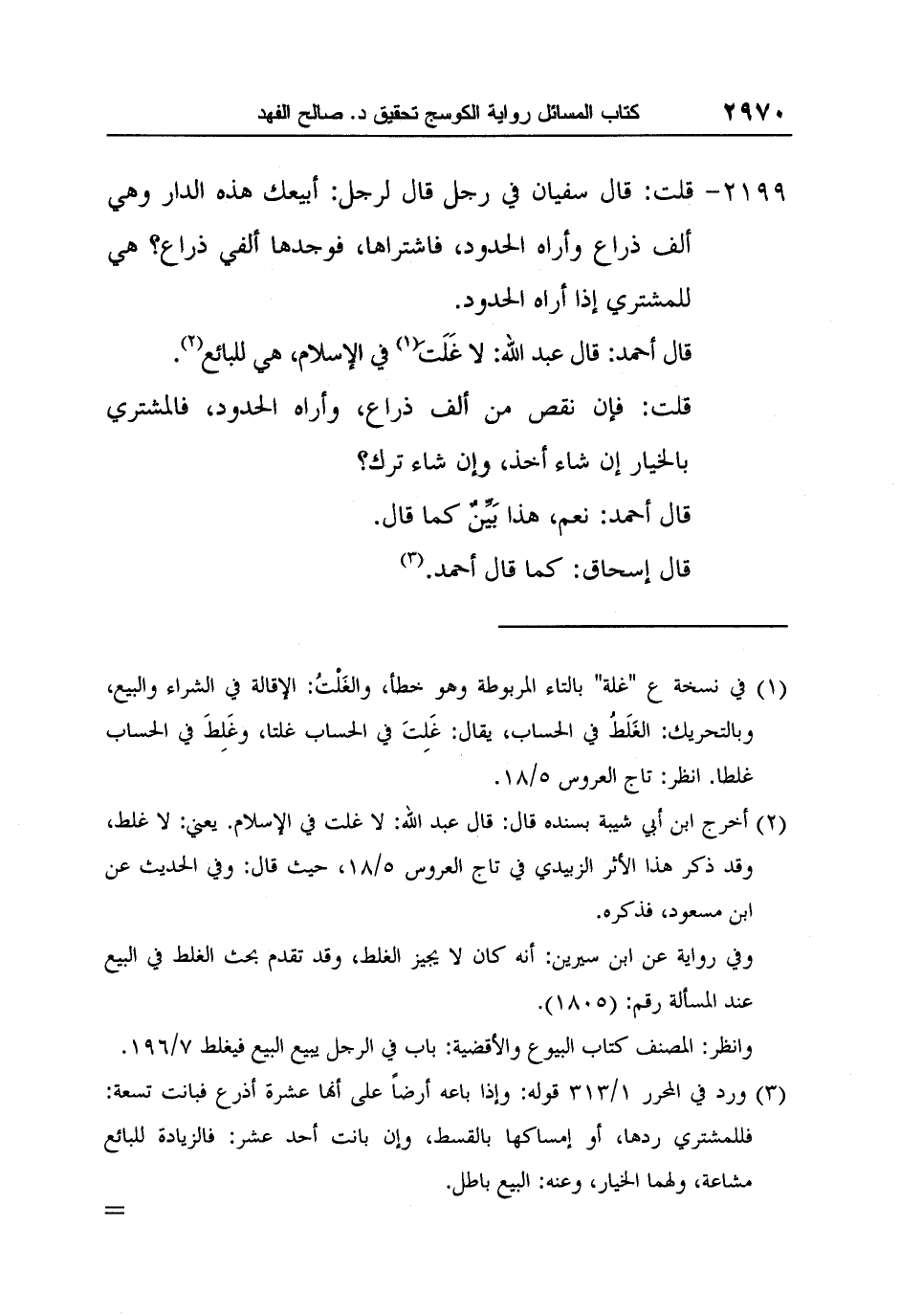 [2199-] قلت: قال سفيان في رجل قال لرجل: أبيعك هذه الدار وهي ألف ذراع وأراه الحدود، فاشتراها، فوجدها ألفي ذراع؟ هي للمشتري إذا أراه الحدود.