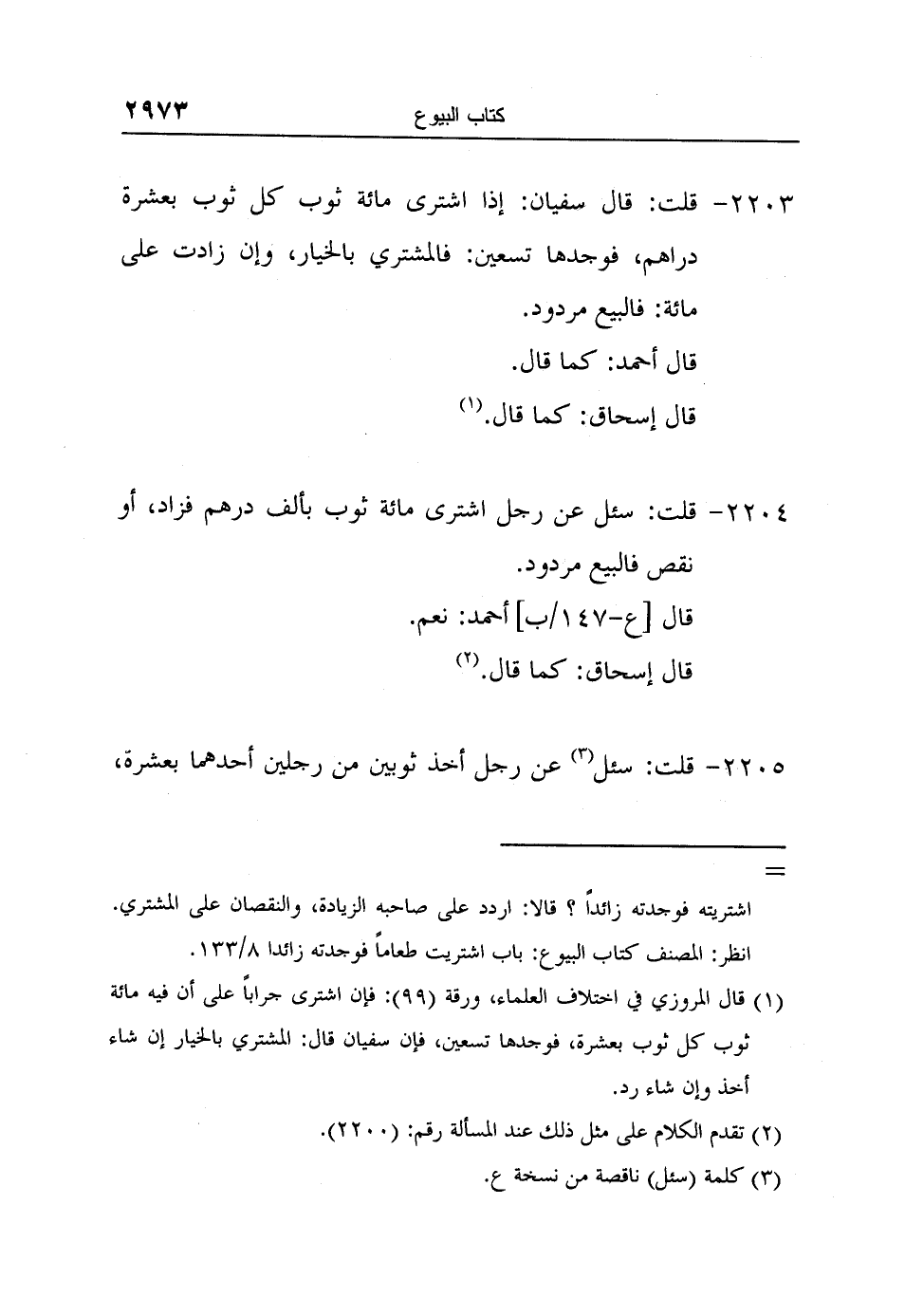 [2203-] قلت: قال سفيان: إذا اشترى مائة ثوب كل ثوب بعشرة دراهم، فوجدها تسعين: فالمشتري بالخيار، وإن زادت على مائة: فالبيع مردود.
