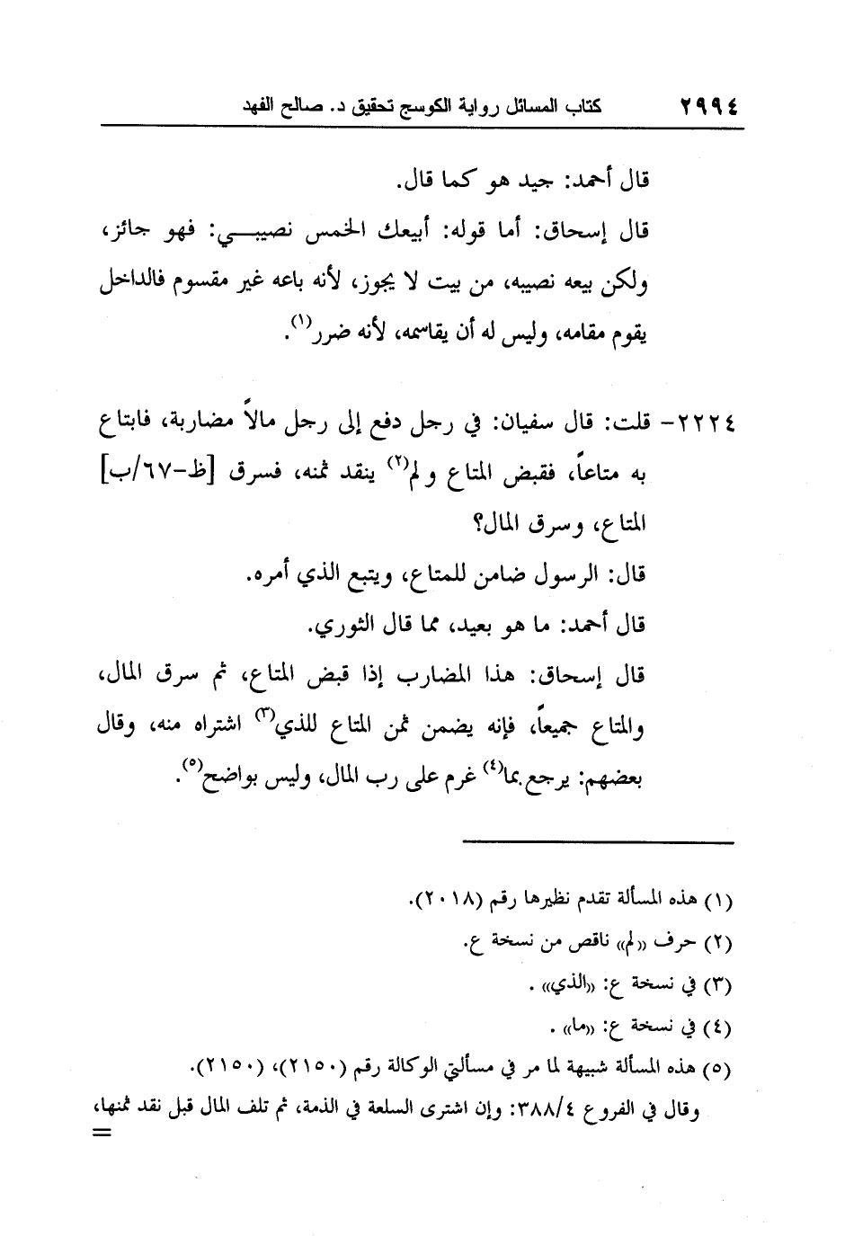 [2224-] قلت: قال سفيان: في رجل دفع إلى رجل مالاً مضاربة، فابتاع به متاعاً، فقبض المتاع ولم2 ينقد ثمنه، فسرق [ظ-67/ب] المتاع، وسرق المال؟