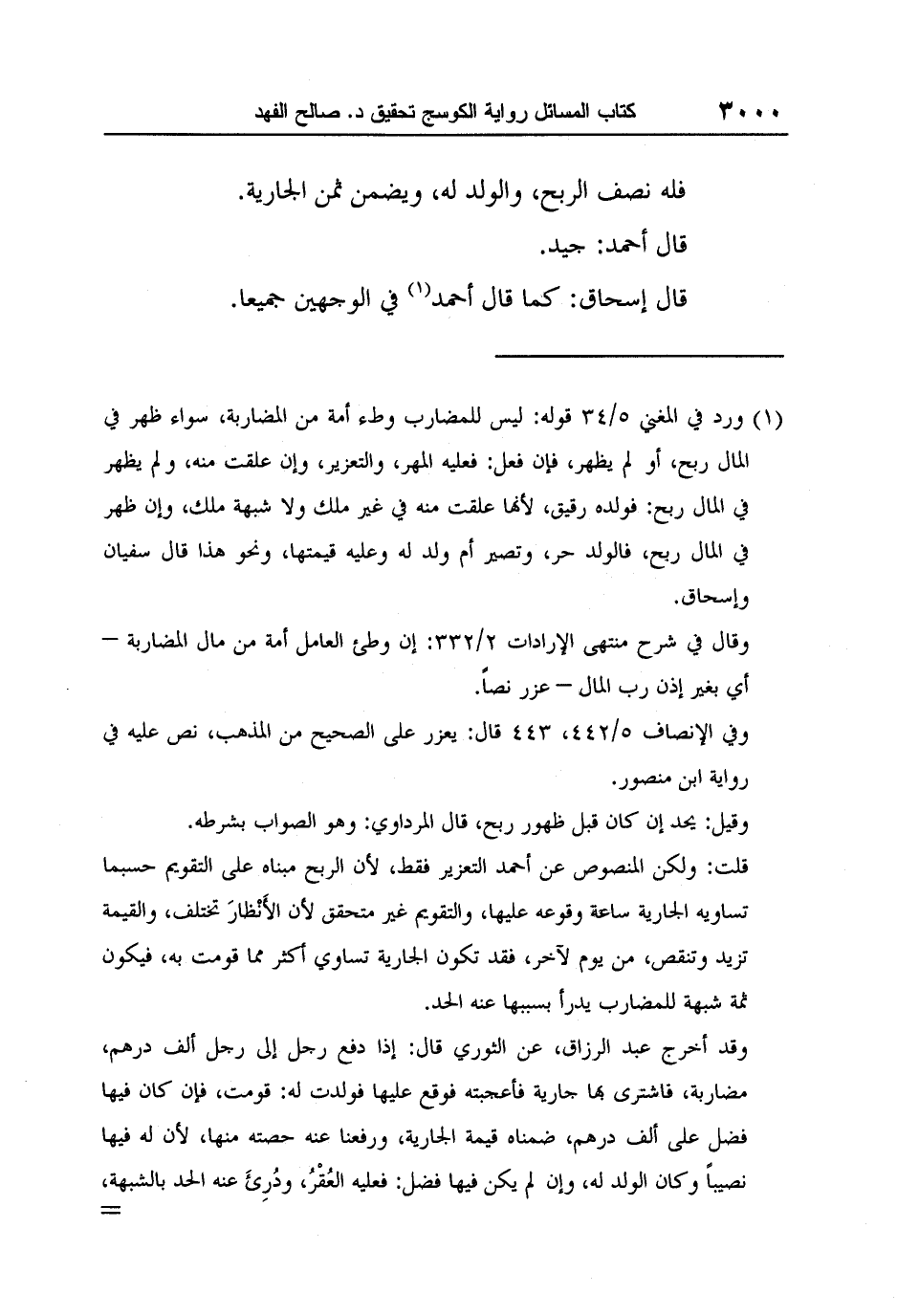 1 ورد في المغني 5/34 قوله: ليس للمضارب وطء أمة من المضاربة، سواء ظهر في المال ربح، أو لم يظهر، فإن فعل: فعليه المهر، والتعزير، وإن علقت منه، ولم يظهر في المال ربح: فولده رقيق، لأنها علقت منه في غير ملك ولا شبهة ملك، وإن ظهر في المال ربح، فالولد حر، وتصير أم ولد له وعليه قيمتها، ونحو هذا قال سفيان وإسحاق.